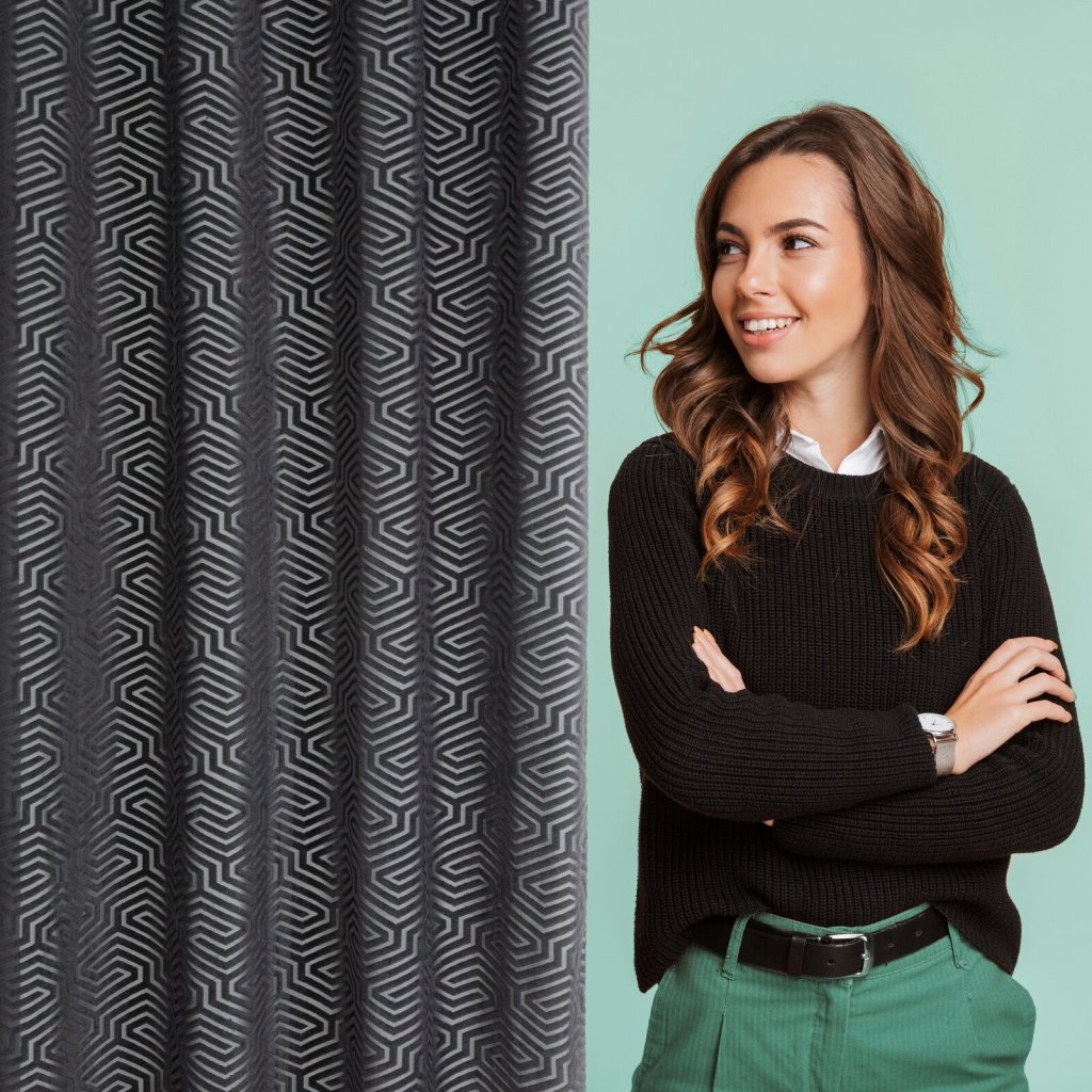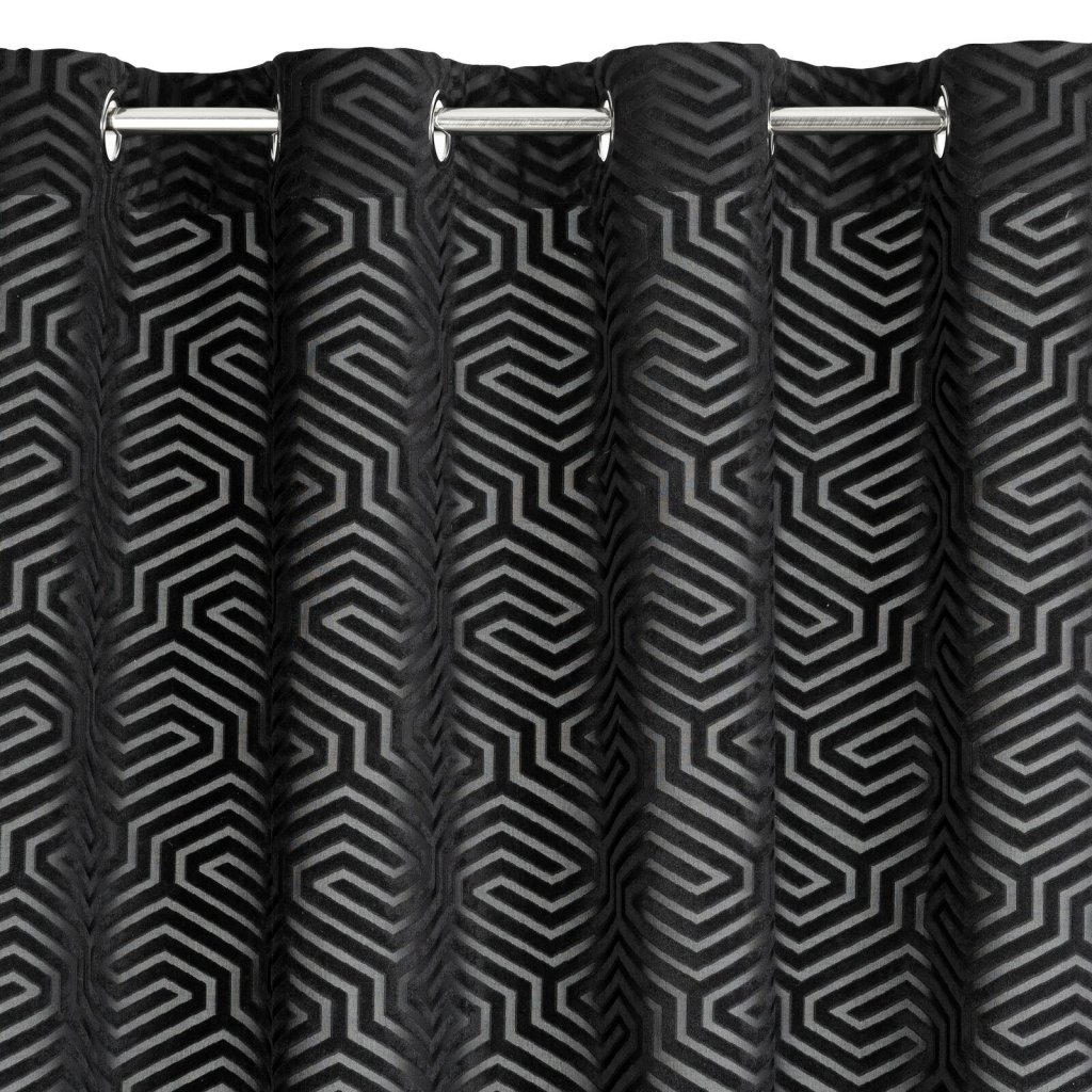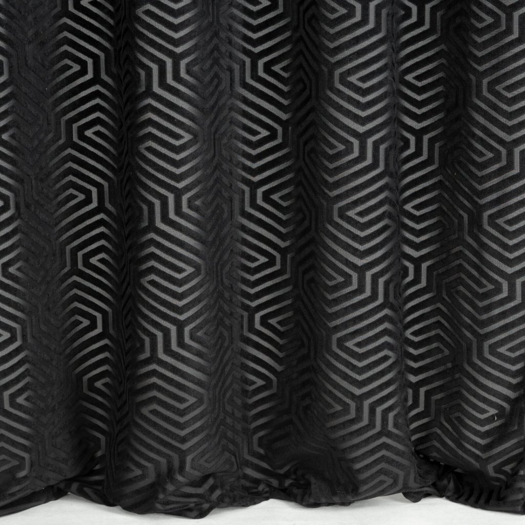 Žakárový sametový závěs s geometrickým motivem z kolekce Pierre Cardin. Šířka: 140 cm, délka: 250 cm, barva: černá, hmotnost: 200 GSM, složení: 100 % polyesterDoplňkové parametry