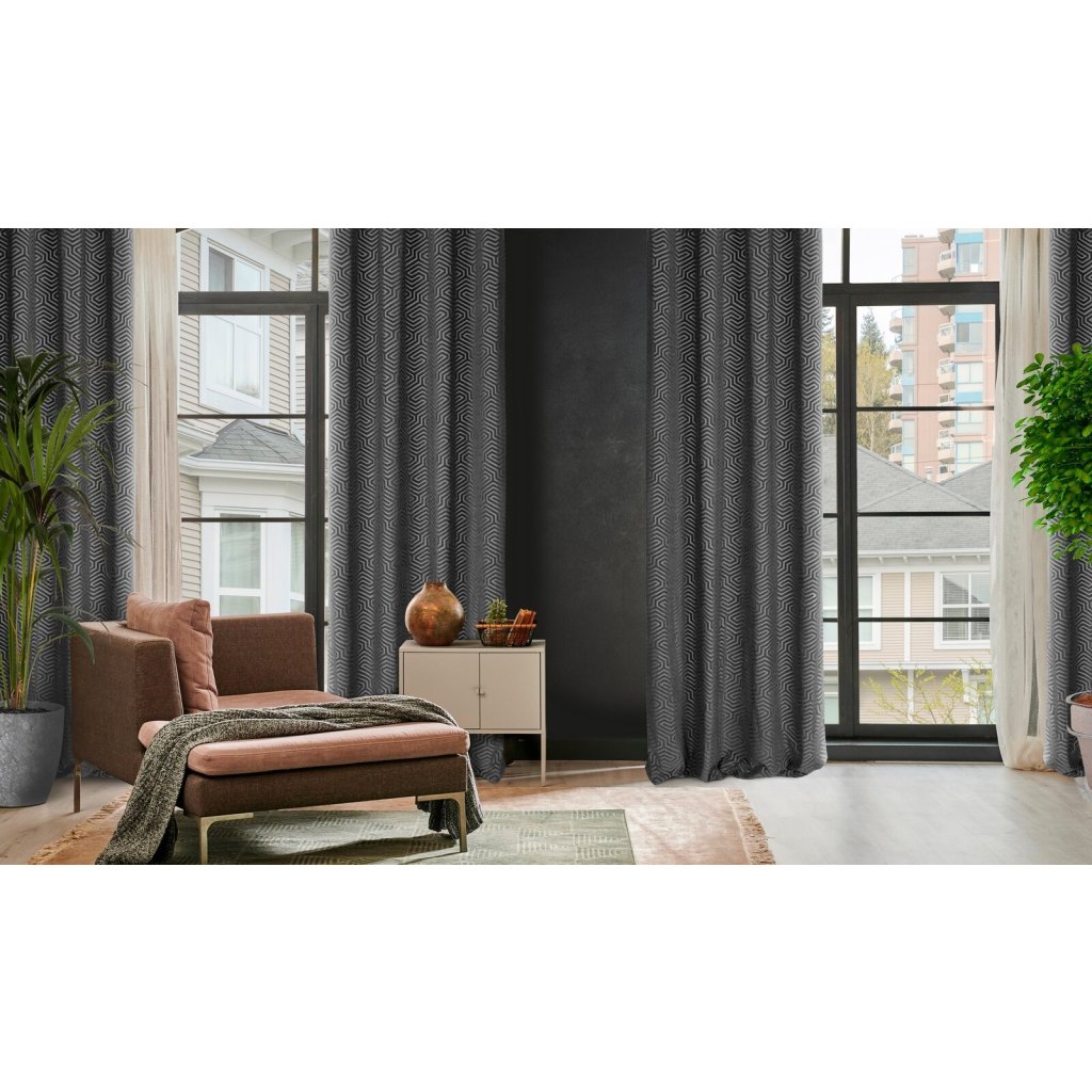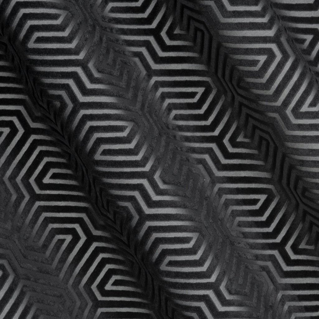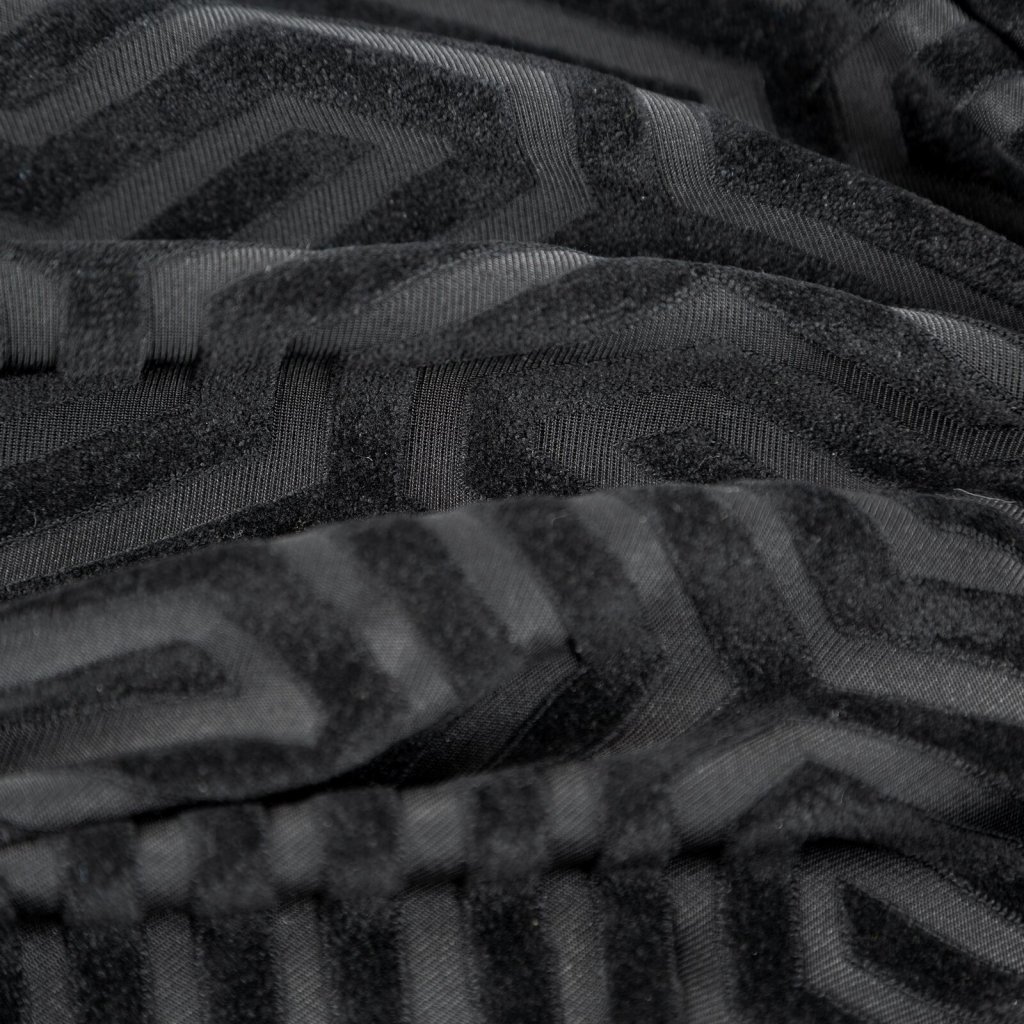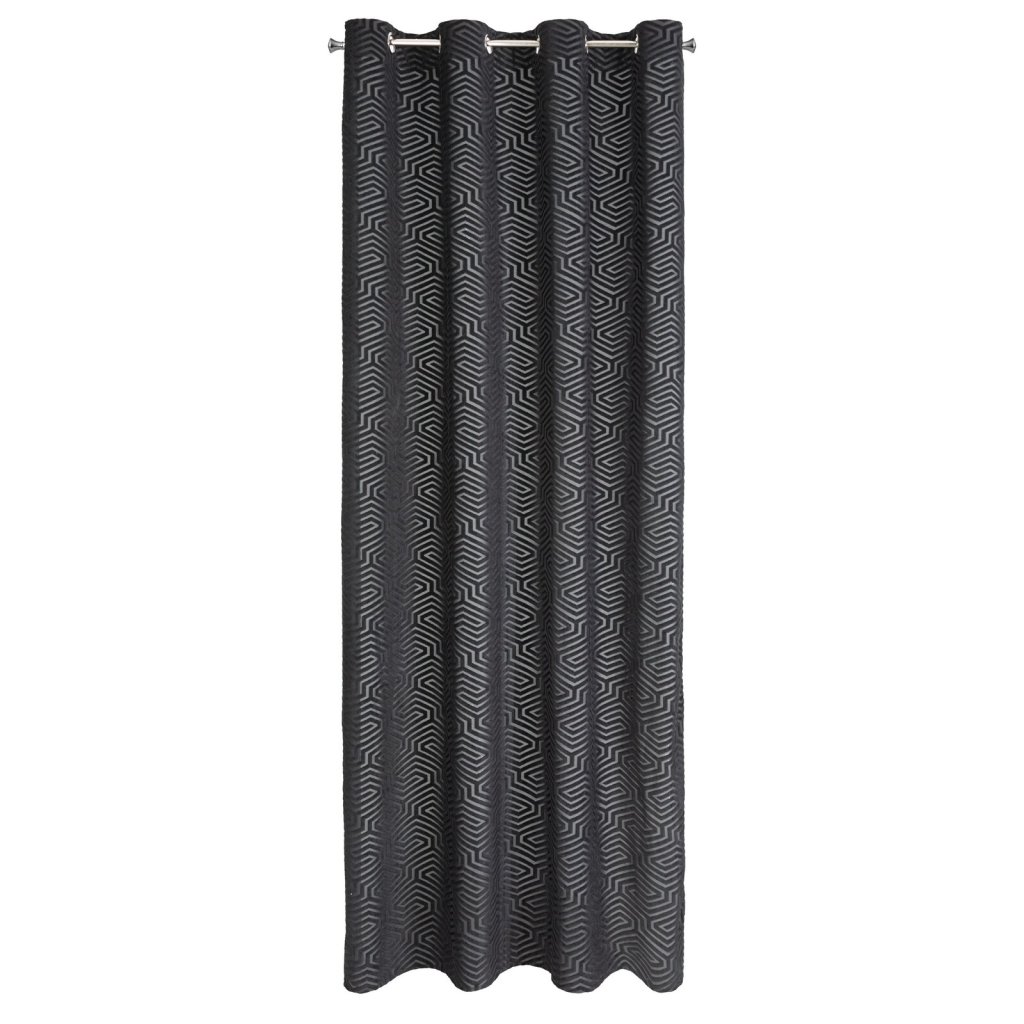 Žakárový sametový závěs s geometrickým motivem z kolekce Pierre Cardin. Šířka: 140 cm, délka: 250 cm, barva: černá, hmotnost: 200 GSM, složení: 100 % polyesterDoplňkové parametry
