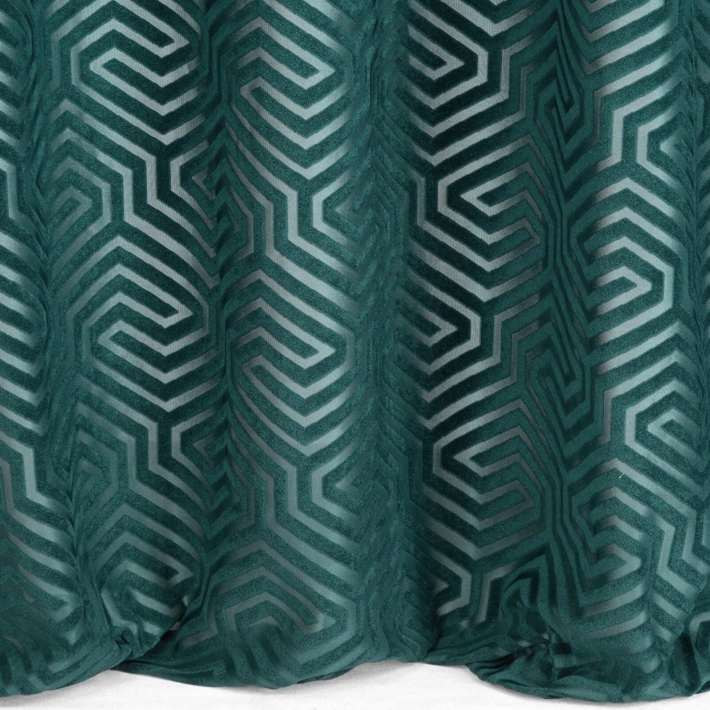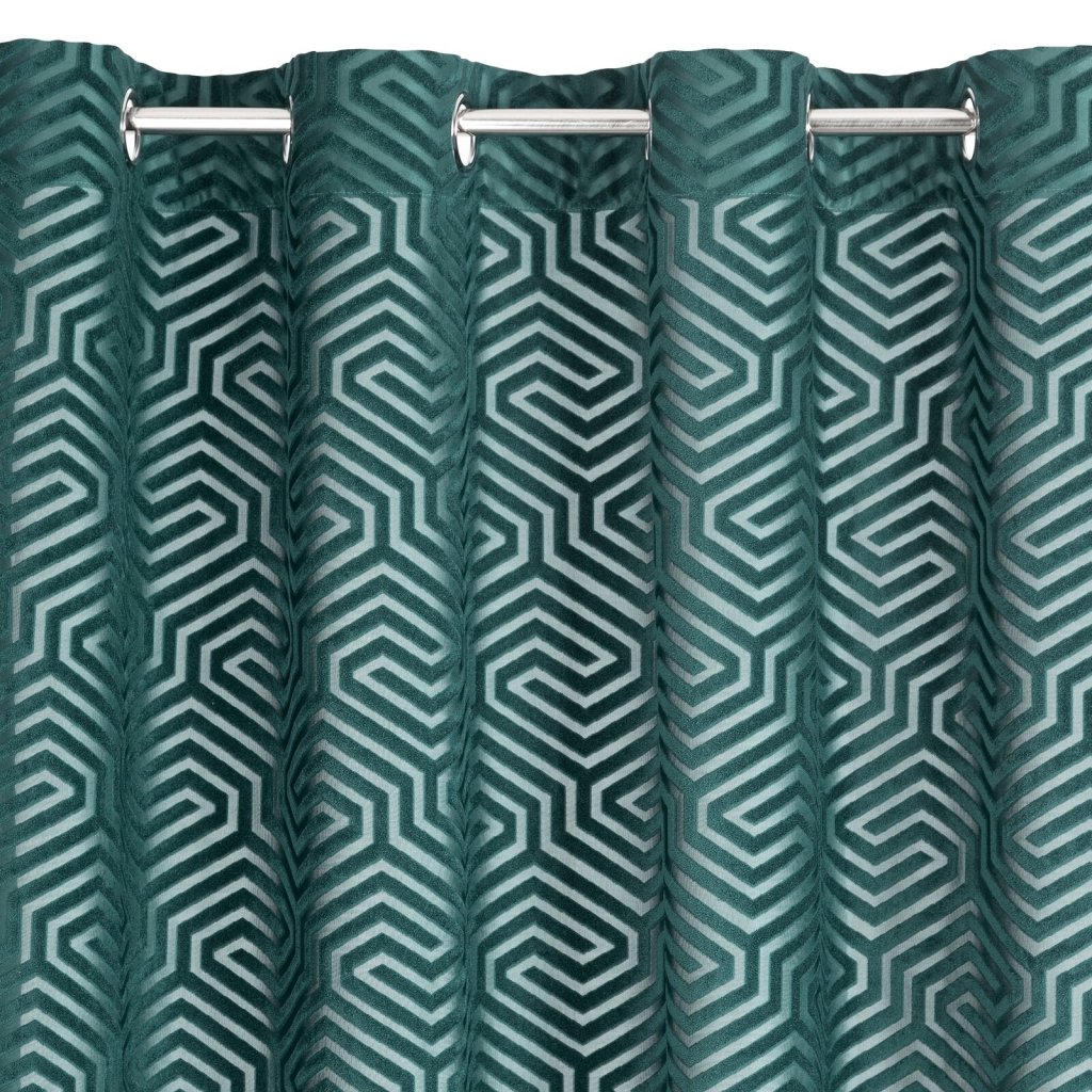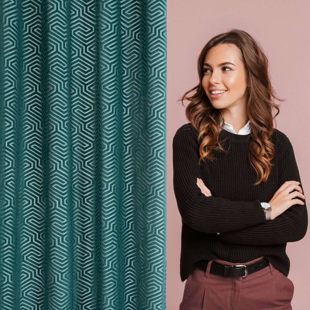Žakárový sametový závěs s geometrickým motivem z kolekce Pierre Cardin. Šířka: 140 cm, délka: 250 cm, barva: zelená, hmotnost: 200 GSM, složení: 100 % polyesterDoplňkové parametry