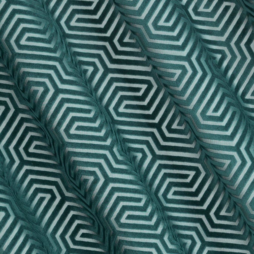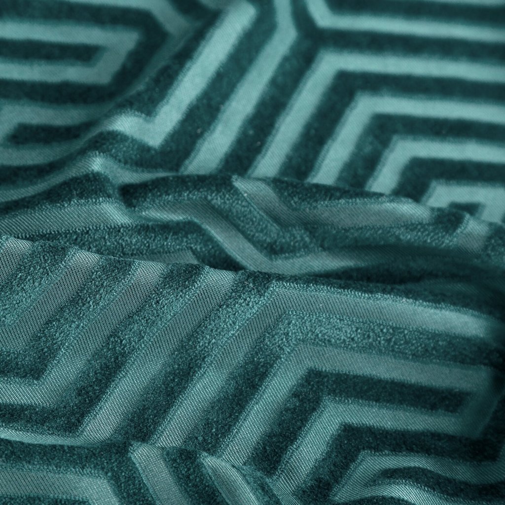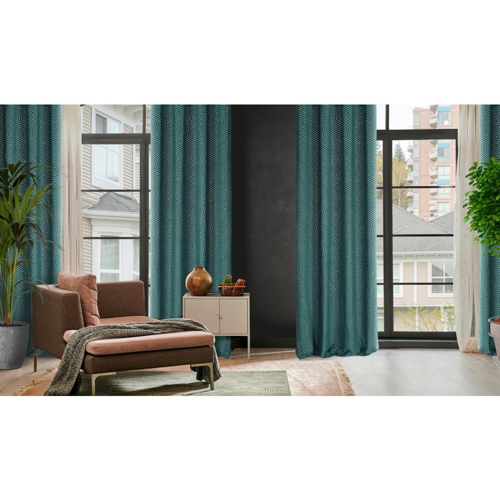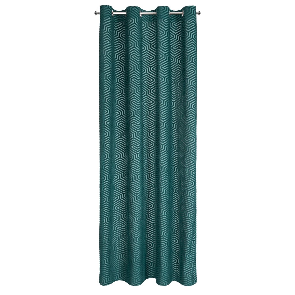 Žakárový sametový závěs s geometrickým motivem z kolekce Pierre Cardin. Šířka: 140 cm, délka: 250 cm, barva: zelená, hmotnost: 200 GSM, složení: 100 % polyesterDoplňkové parametry