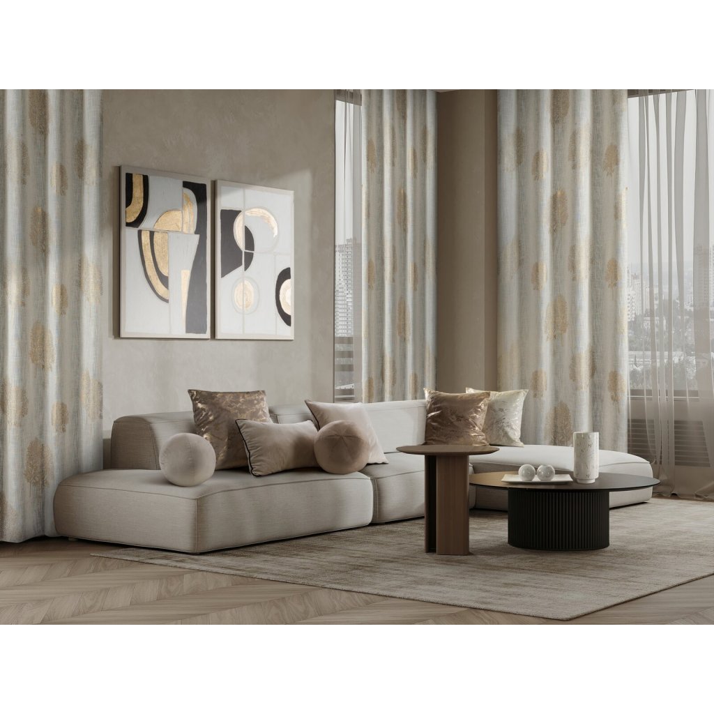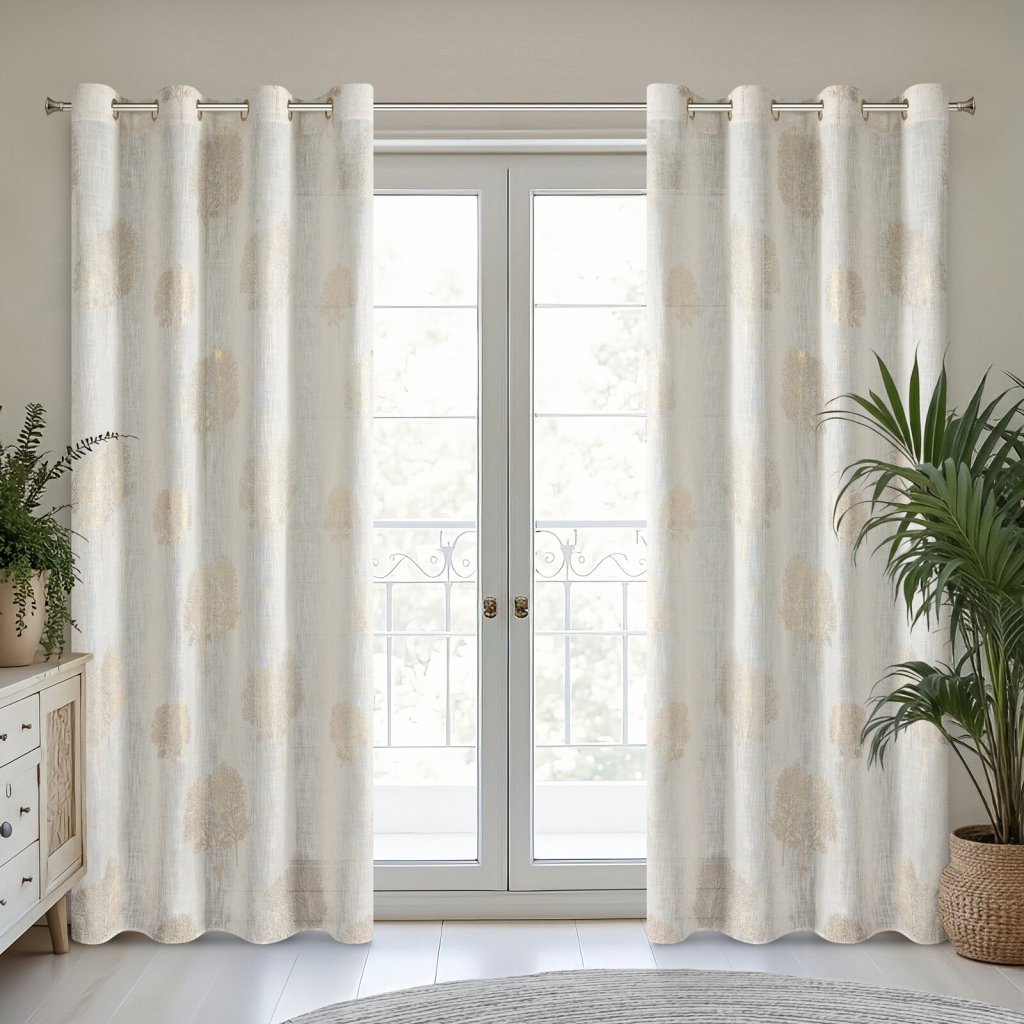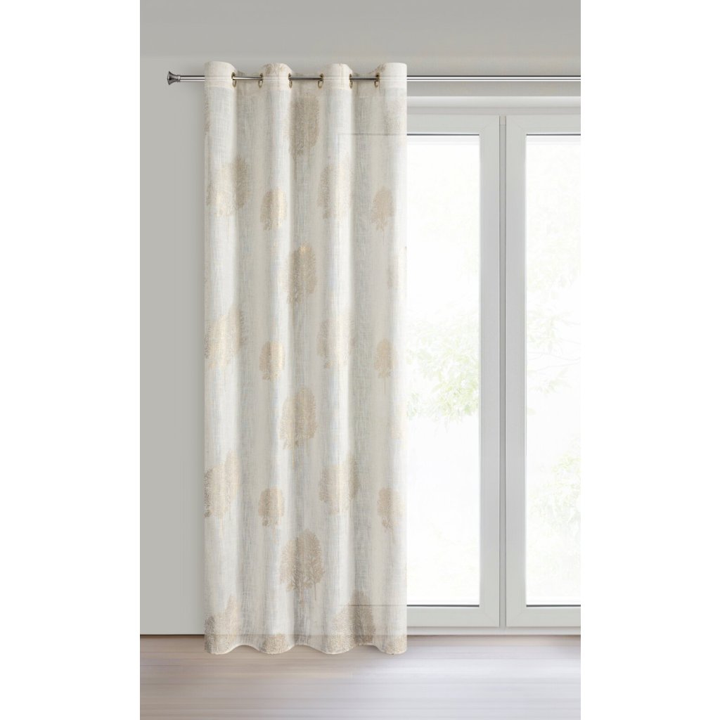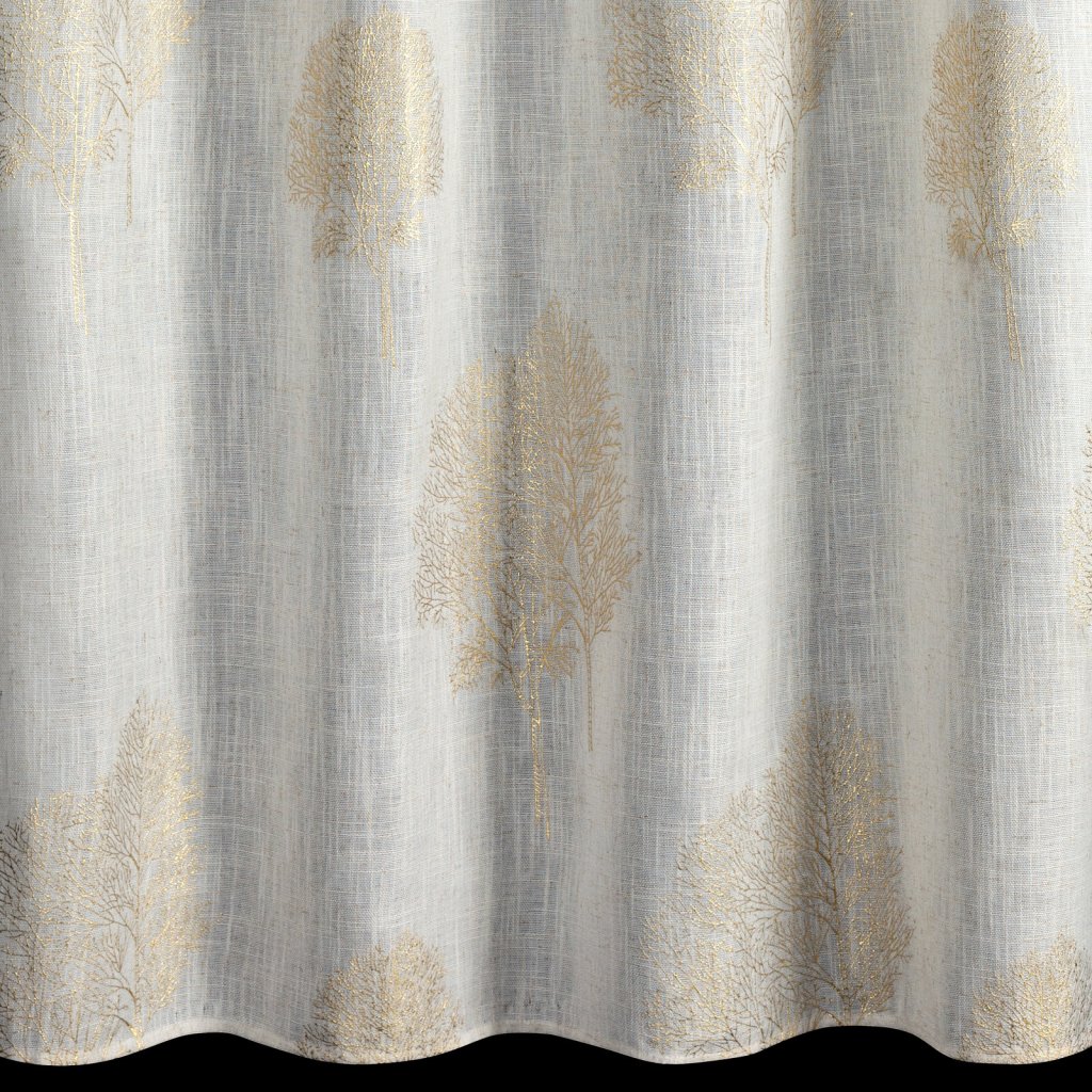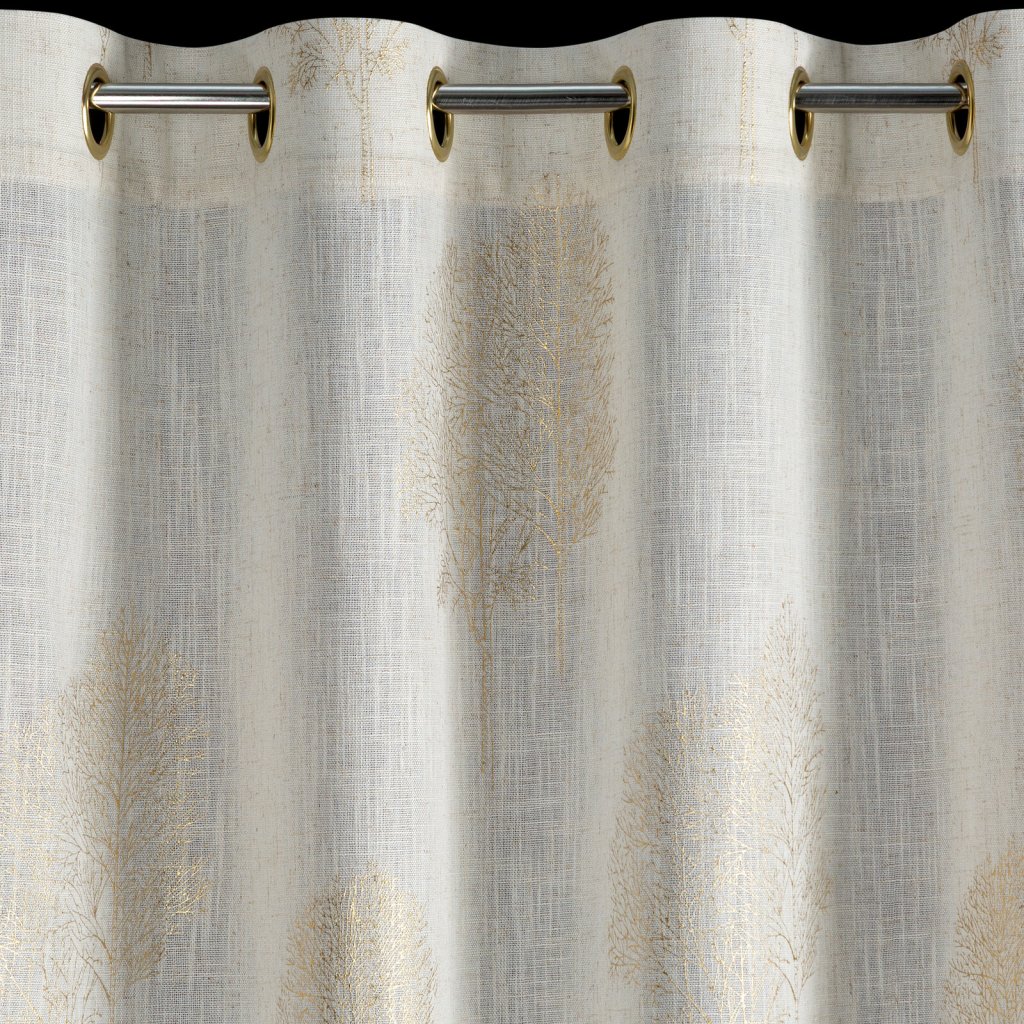 Hotový závěs SALINA vyrobený z přírodní tkaniny s nádechem lnu kombinuje eleganci s estetikou. Jeho povrch je zdoben reliéfním zlatým potiskem s motivem stromů, který dodává látce jedinečný charakter a jemný lesk. Textura „deště“ dodává látce hloubku a trojrozměrný efekt. Šířka: 140 cm, délka: 250 cm, barva: krémová a zlatá, hmotnost: 180 GSM, složení: 5% len, 95% polyester.Doplňkové parametry