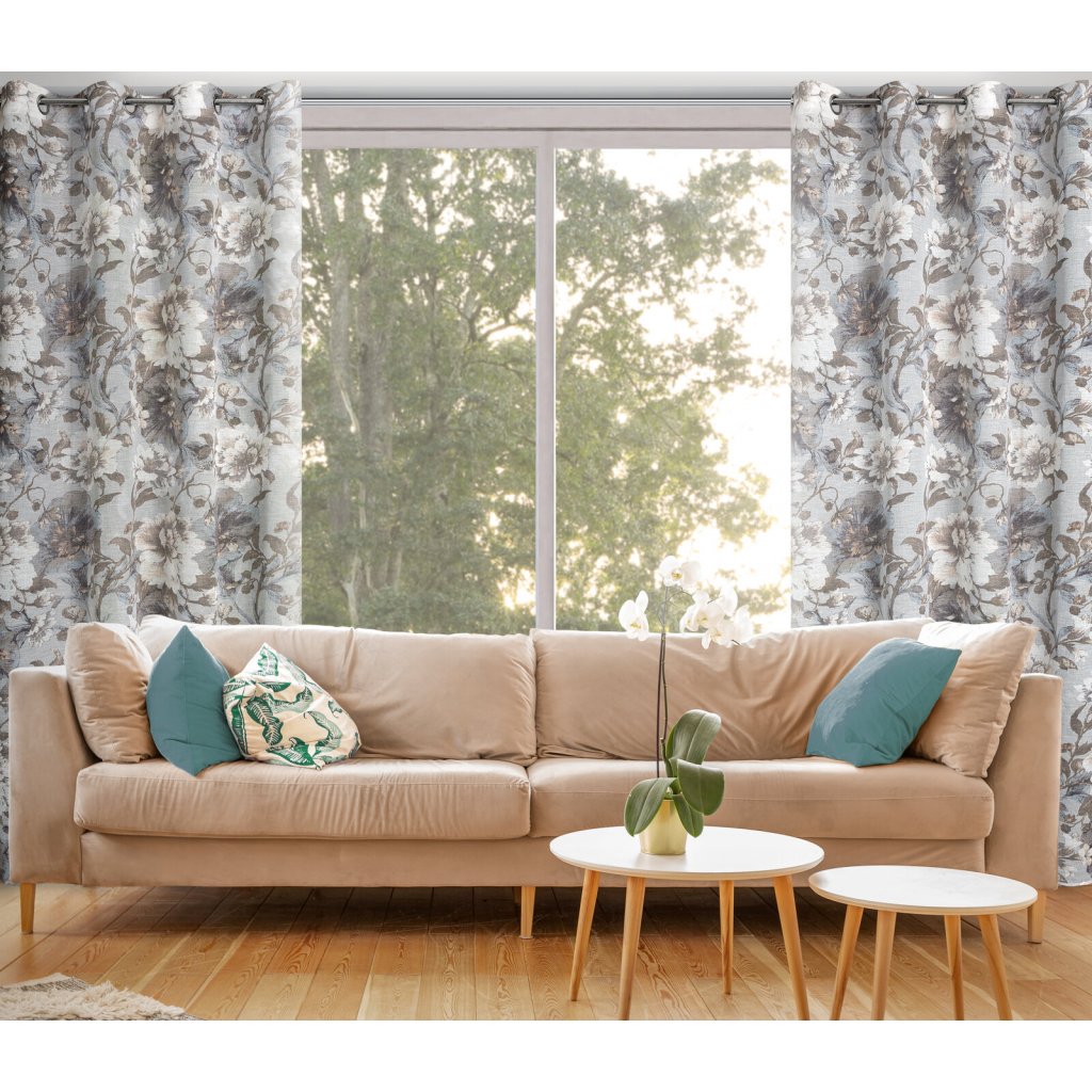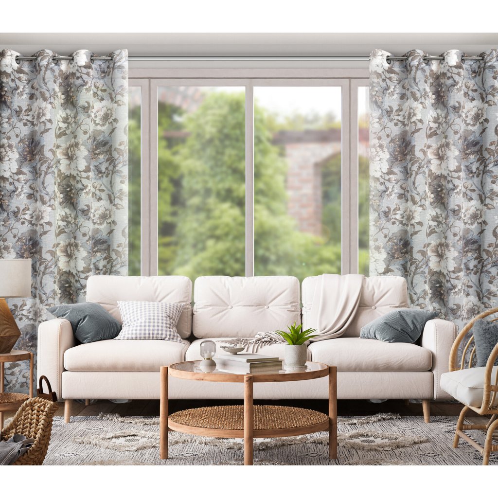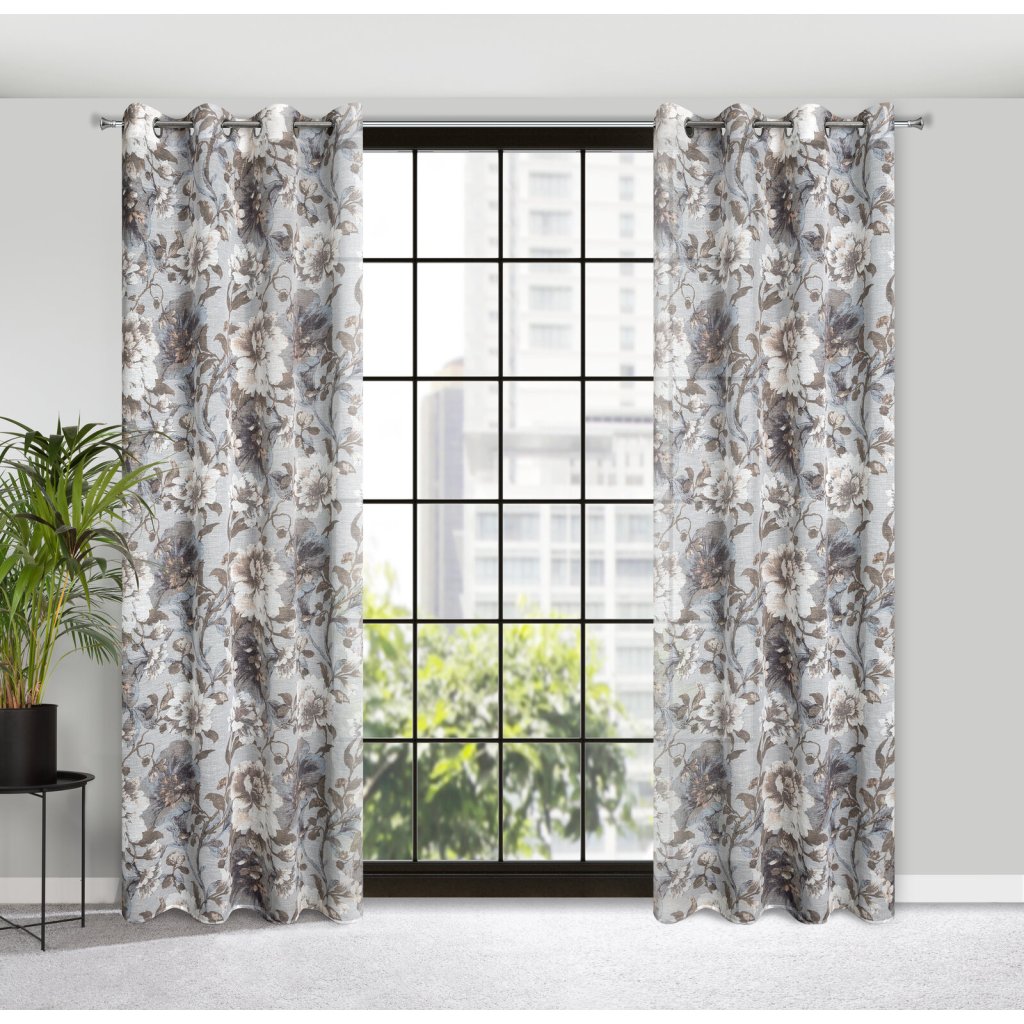 Závěs v eko stylu s květinovým potiskem, šířka: 140 cm, délka: 250 cm, barva: šedá, hmotnost: 110 GSM, složení: 100% polyester.Doplňkové parametry