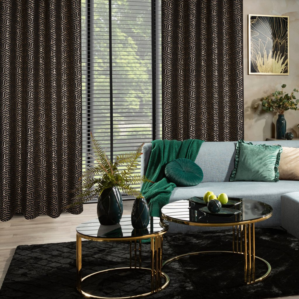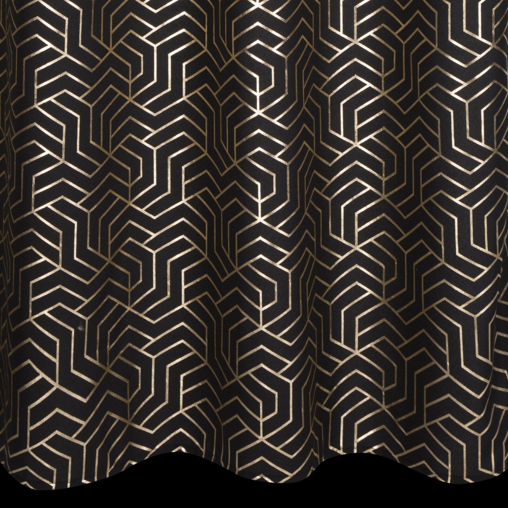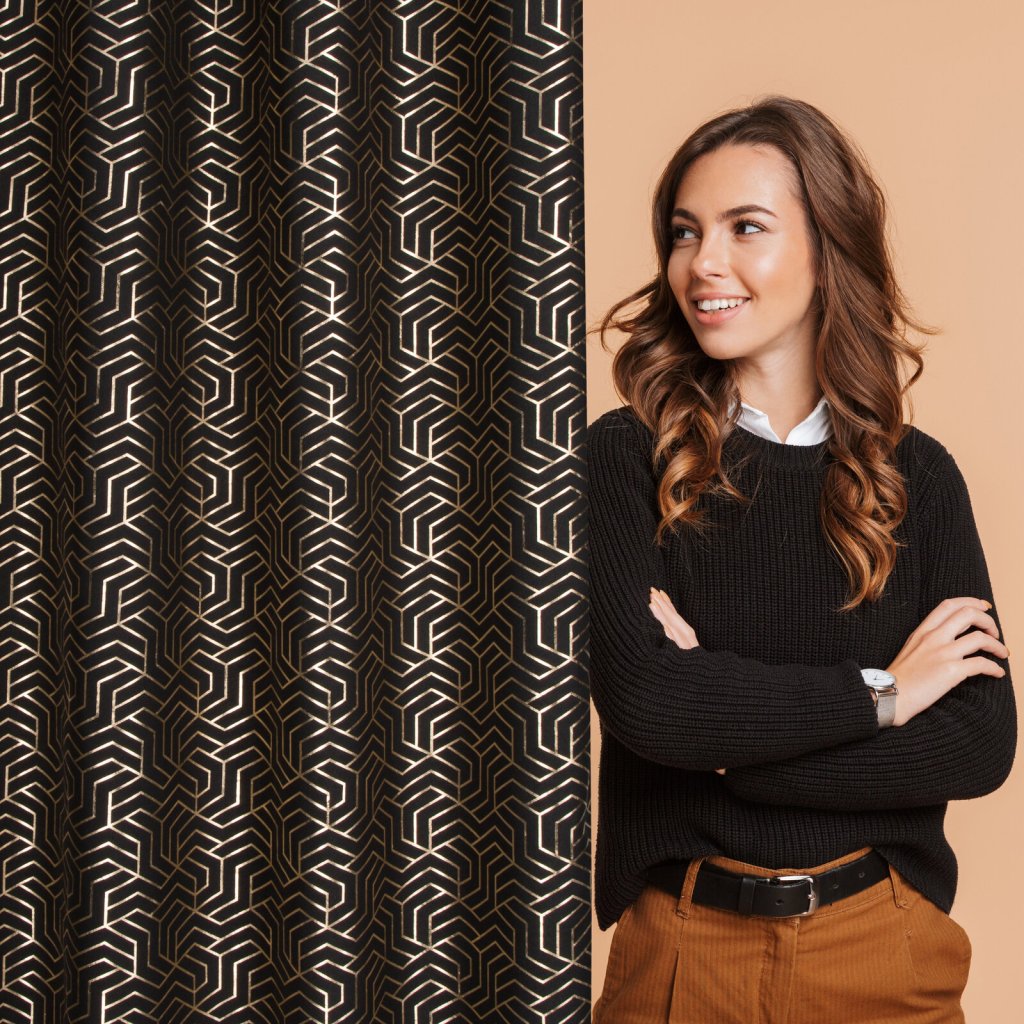 Hotový závěs SEMI z látky oxford, který zdobí geometrický potisk, který je v lesklém šampaňském potisku. Tento typ tkaniny je hustý, odolný a má jemnou texturu, což mu dodává elegantní vzhled. Světlá tkanina jemně chrání interiér před slunečním zářením, jemně filtruje světlo bez zatemnění interiéru. Šířka: 140 cm, délka: 250 cm, hmotnost: 140 GSM, barva: černá a šampaňská, složení: 100% polyester.Doplňkové parametry