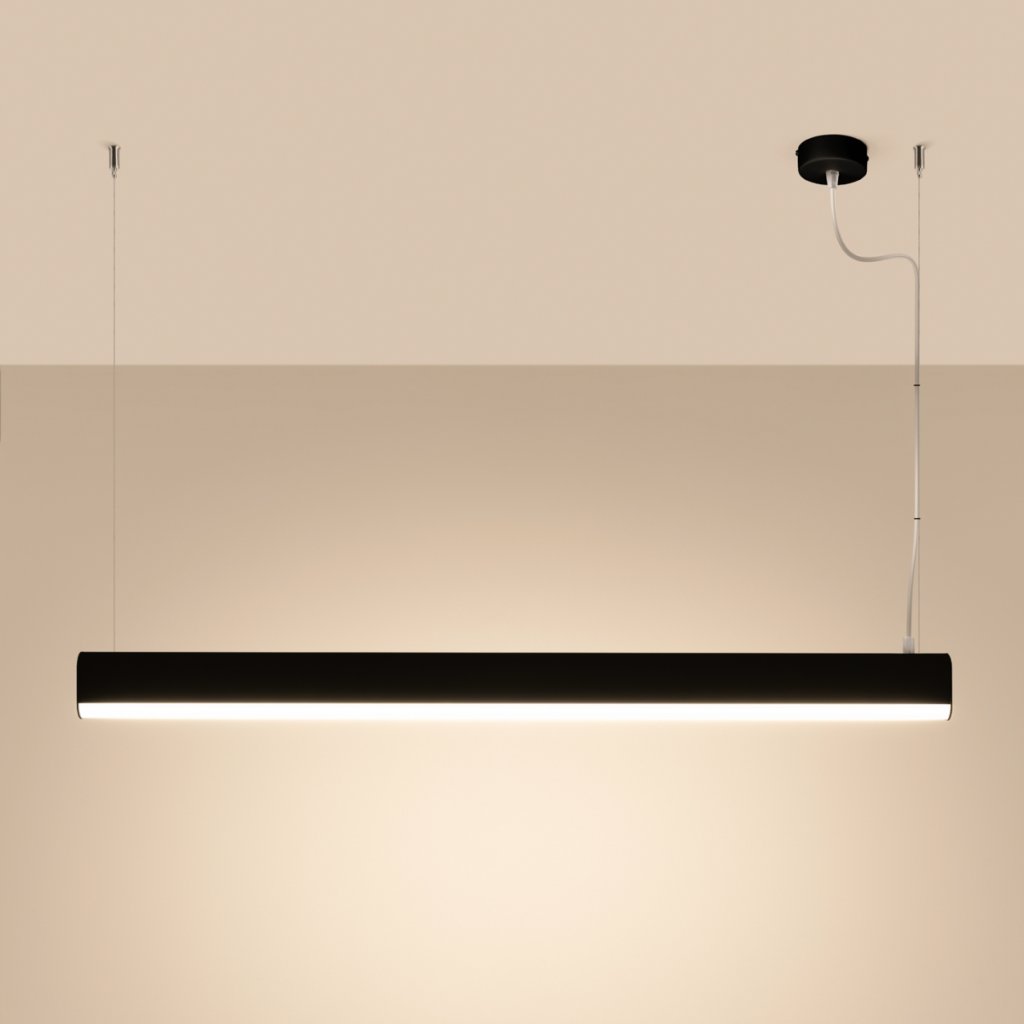 Moderní LED osvětlení v podobě závěsného svítidla. Svítidlo má jednoduché, lineární podlouhlé tvary, které mu dodávají minimalistický a moderní styl. Je zavěšeno na dvou subtilních kabelech, které zajišťují stabilitu a dodávají designu pocit lehkosti. Světelný prvek je elegantně integrován do struktury svítidla, což zajišťuje rovnoměrné rozložení světla. Napájecí kabel je sotva viditelný a harmonicky doplňuje celkový vzhled. Takové svítidlo se bude skvěle hodit jako osvětlení jídelny nebo pracovního prostoru, kde se praktičnost snoubí s estetickým designem.Svítidlo je ideální pro osvětlení jídelny nebo pracovního prostoru, kde se praktičnost snoubí s estetickým designem.