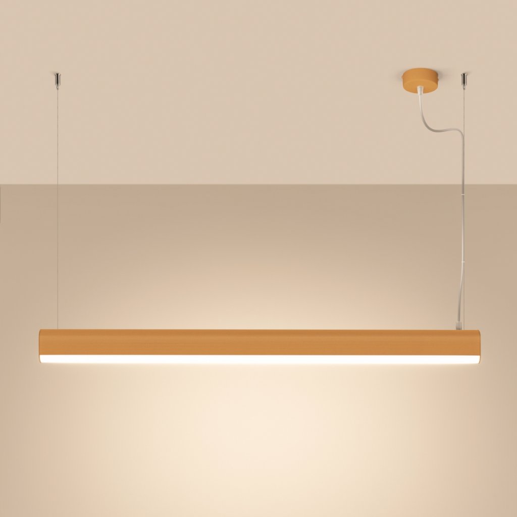 Moderní LED osvětlení v podobě závěsného svítidla. Svítidlo má jednoduché, lineární podlouhlé tvary, které mu dodávají minimalistický a moderní styl. Je zavěšeno na dvou subtilních kabelech, které zajišťují stabilitu a dodávají designu pocit lehkosti. Světelný prvek je elegantně integrován do struktury svítidla, což zajišťuje rovnoměrné rozložení světla. Napájecí kabel je sotva viditelný a harmonicky doplňuje celkový vzhled. Takové svítidlo se bude skvěle hodit jako osvětlení jídelny nebo pracovního prostoru, kde se praktičnost snoubí s estetickým designem.Svítidlo je ideální pro osvětlení jídelny nebo pracovního prostoru, kde se praktičnost snoubí s estetickým designem.
