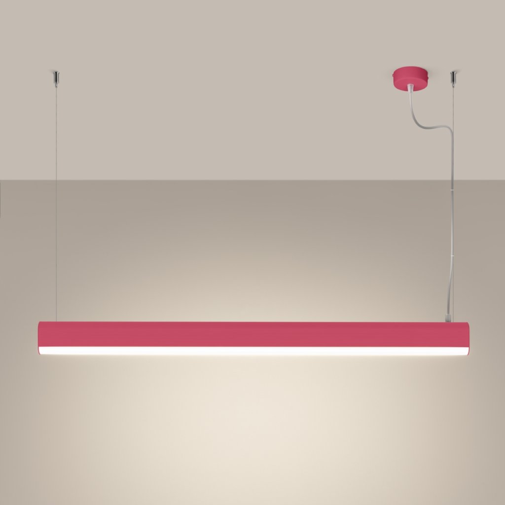 Moderní LED osvětlení v podobě závěsného svítidla. Svítidlo má jednoduché, lineární podlouhlé tvary, které mu dodávají minimalistický a moderní styl. Je zavěšeno na dvou subtilních kabelech, které zajišťují stabilitu a dodávají designu pocit lehkosti. Světelný prvek je elegantně integrován do struktury svítidla, což zajišťuje rovnoměrné rozložení světla. Napájecí kabel je sotva viditelný a harmonicky doplňuje celkový vzhled. Takové svítidlo se bude skvěle hodit jako osvětlení jídelny nebo pracovního prostoru, kde se praktičnost snoubí s estetickým designem.Svítidlo je ideální pro osvětlení jídelny nebo pracovního prostoru, kde se praktičnost snoubí s estetickým designem.