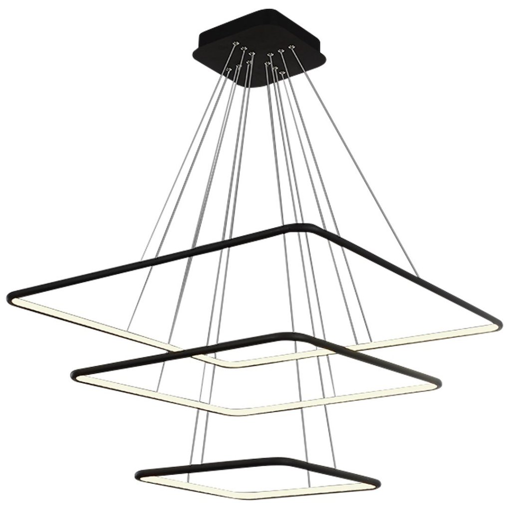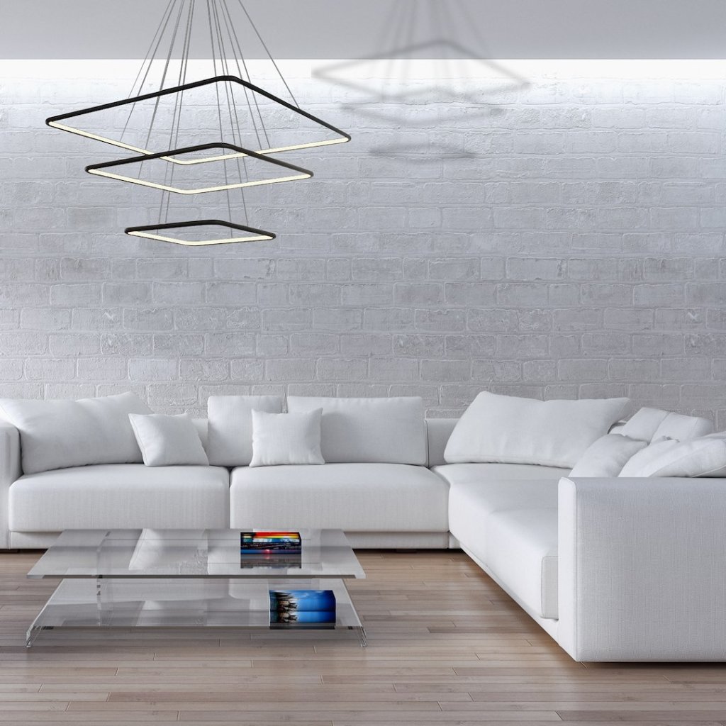 Závěsné LED svítidlo NIX BLACK 519 představuje moderní designový doplněk, který vynikne v každém interiéru. Svítilna se skládá ze tří horizontálně orientovaných čtvercových stínidel různých rozměrů, přičemž největší dosahuje šířky až 80 cm , a nejmenší 40 cm . Každé stínítko je zavěšeno na samostatných, výškově stavitelných lankách, ukotvených do elegantní čtvercové základny v černém provedení.