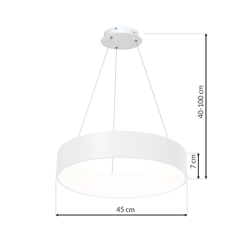 Závěsné LED svítidlo OHIO v bílém provedení je ukázkou moderního designu s futuristickým nádechem . Kolekce OHIO je určena pro milovníky čistých linií a technologicky vyspělých řešení. Dominantou tohoto modelu je kruhové stínítko ve tvaru prstence , které působí elegantně a vzdušně díky téměř neviditelným závěsným lankám .