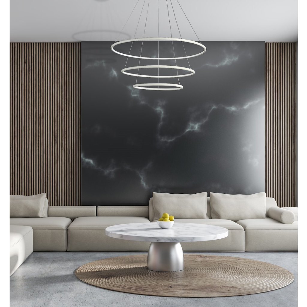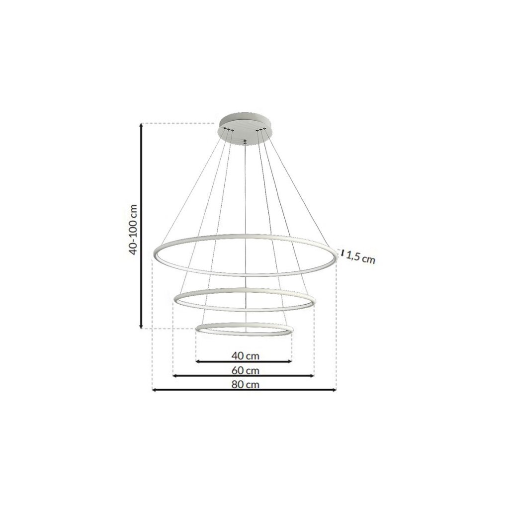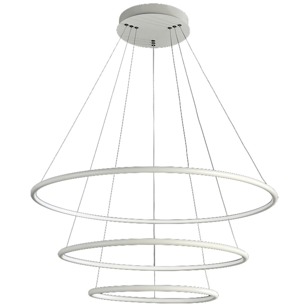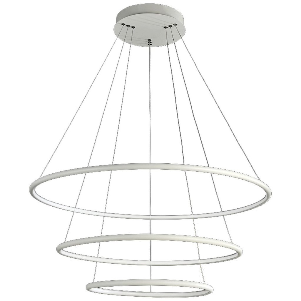 Závěsná LED svítilna Orion tvoří tři kruhová stínítka s možností nastavení výšky zavěšení až do 100 cm , díky čemuž se dokonale přizpůsobí místnostem s různou výškou stropů. Stínítka mají různé průměry: 40 cm, 60 cm a 80 cm . V každém stínítku je zabudován vyměnitelný LED modul s celkovým výkonem 99 W , který nahrazuje až 500 W tradiční žárovky. Svítilna vyzařuje příjemné, teplé světlo s teplotou barvy 3000 K a velmi vysokým světelným tokem 6930 lm . Vyrobeno je z kvalitního kovu a akrylu.
