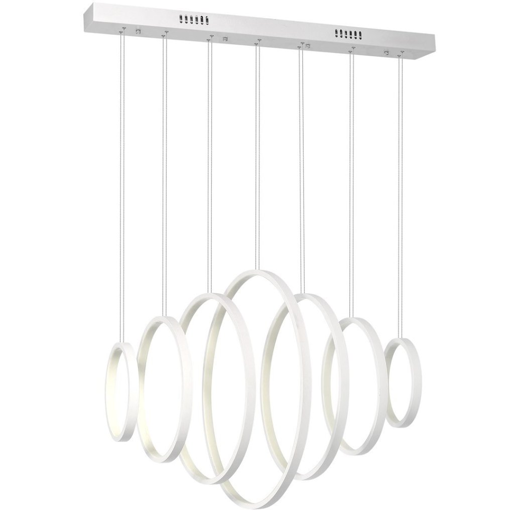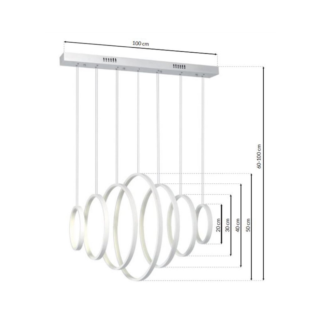 Svítilna obsahuje 7 kruhových prvků o průměrech: 2x 20 cm , 2x 30 cm , 2x 40 cm a středový prvek 50 cm . Zavěšení na nastavitelném lanku o maximální výšce 100 cm umožňuje přizpůsobení svítidla konkrétnímu interiéru. Sedmi prvky uspořádanými paralelně nebo v různých výškách vytváří svítilnu dynamický a elegantní efekt .