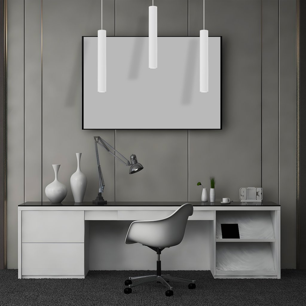 Bílá kovová stínítka zajišťují efektivní směrování světla a v kombinaci s nastavitelnou výškou nabízejí flexibilitu pro různé typy interiérů. Design svítidla působí vzdušně a nepřetěžuje prostor, což oceníš zejména v menších místnostech nebo v otevřených konceptech bydlení.