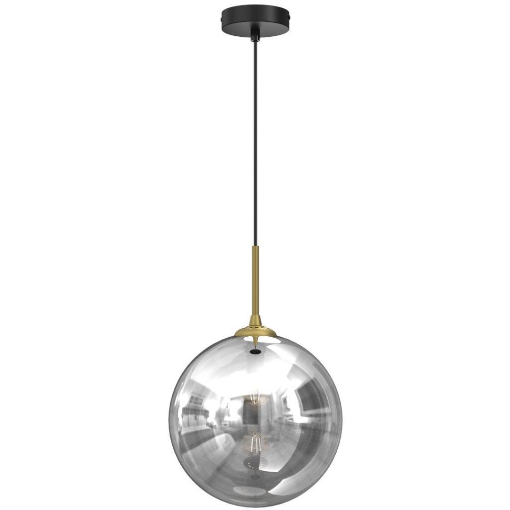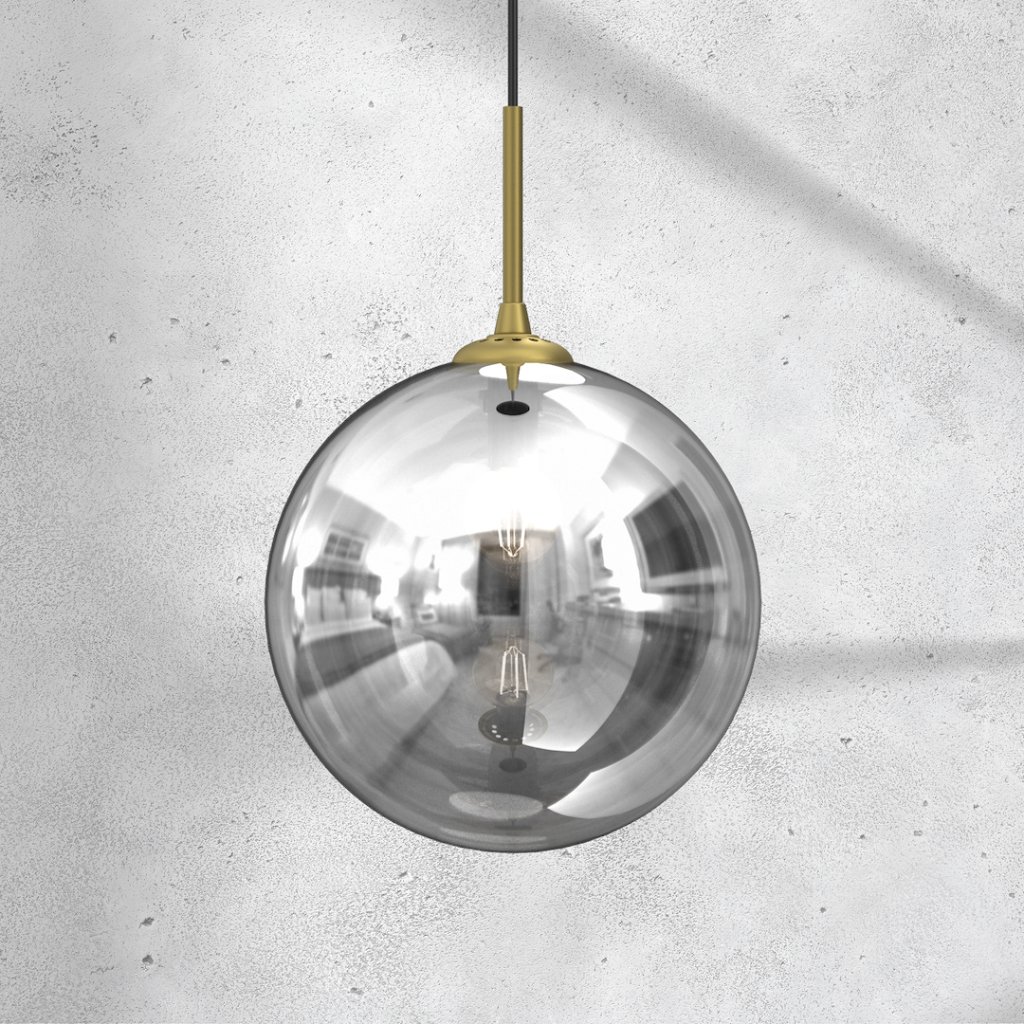Závěsné svítidlo REFLEX s jedním stínítkem z kouřového skla (Ø250 mm) je designovým prvkem, který zaujme i ve vypnutém stavu. Elegantní tvar kouřové skleněné koule a zlatavý detail v oblasti úchytu vytvářejí působivý kontrast k chladným šedým a grafitovým tónům skla.