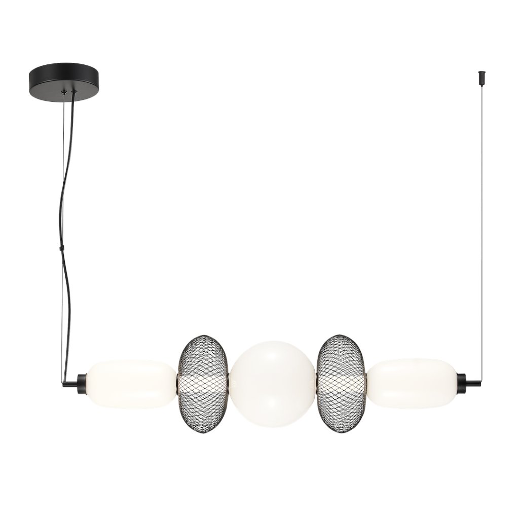 Černá konstrukce podtrhuje moderní vzhled svítidla, zatímco úhel svícení 120° zajišťuje rovnoměrné osvětlení celého prostoru. Kombinace tří bílých skleněných stínítek a dvou černých drátěných prvků vytváří dynamický vizuální efekt, který zaujme v každém interiéru.