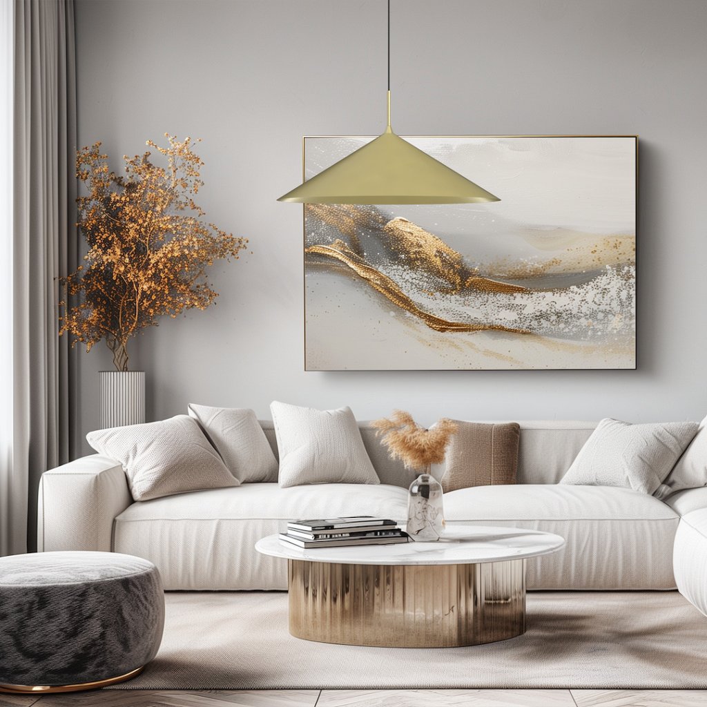 Závěsné svítidlo Capital s impozantním zlatým stínítkem o průměru 60 cm představuje největší model této úspěšné designové kolekce. Je ideální volbou pro ty, kteří hledají výrazný, ale vkusně minimalistický světelný prvek , který bude středem pozornosti v celém prostoru.