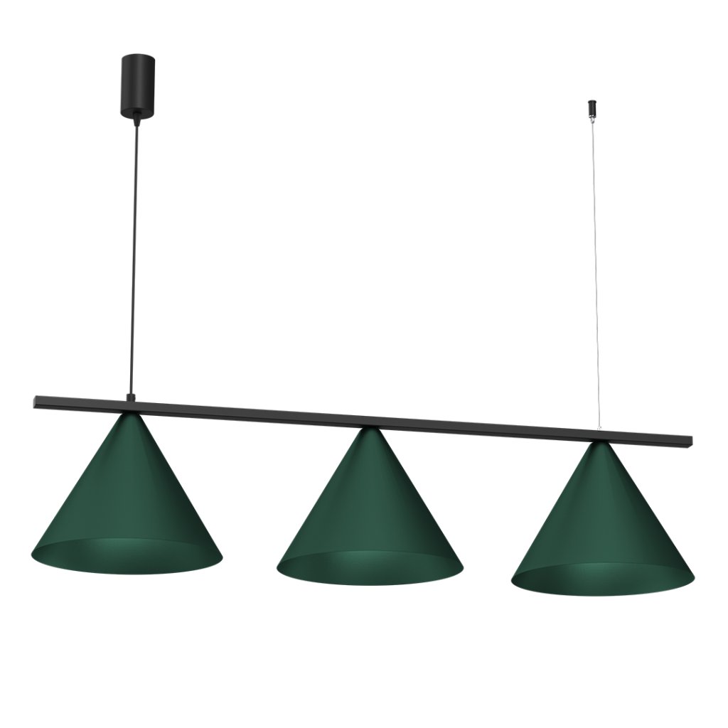 Kónický tvar stínítek působí moderně a zároveň zaručuje efektivní rozptýlení světla. Díky možnosti nastavení výšky zavěšení je svítidlo flexibilní a přizpůsobitelné různým typům interiérů – od kuchyně přes jídelnu až po obývací místnost.