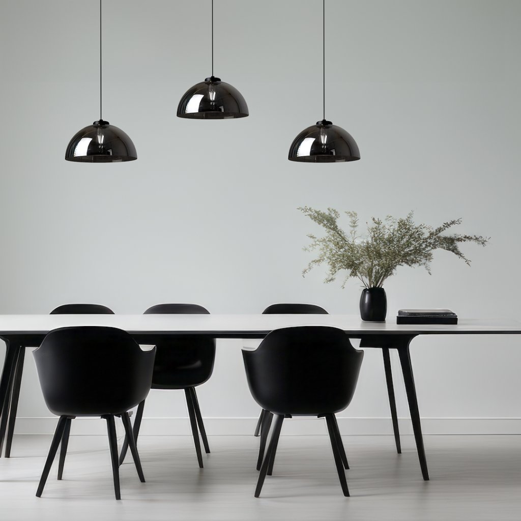 Konstrukce svítidla kombinuje odolný kov a černé sklo , což dodává lampě moderní vzhled a zároveň zajišťuje její dlouhou životnost. Je ideální volbou pro kuchyni, obývací pokoj či jídelnu , kde poslouží nejen jako zdroj světla, ale také jako výrazný designový prvek.