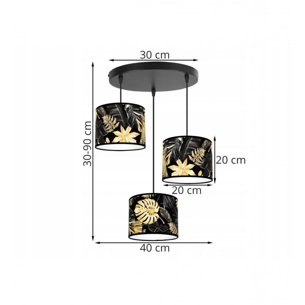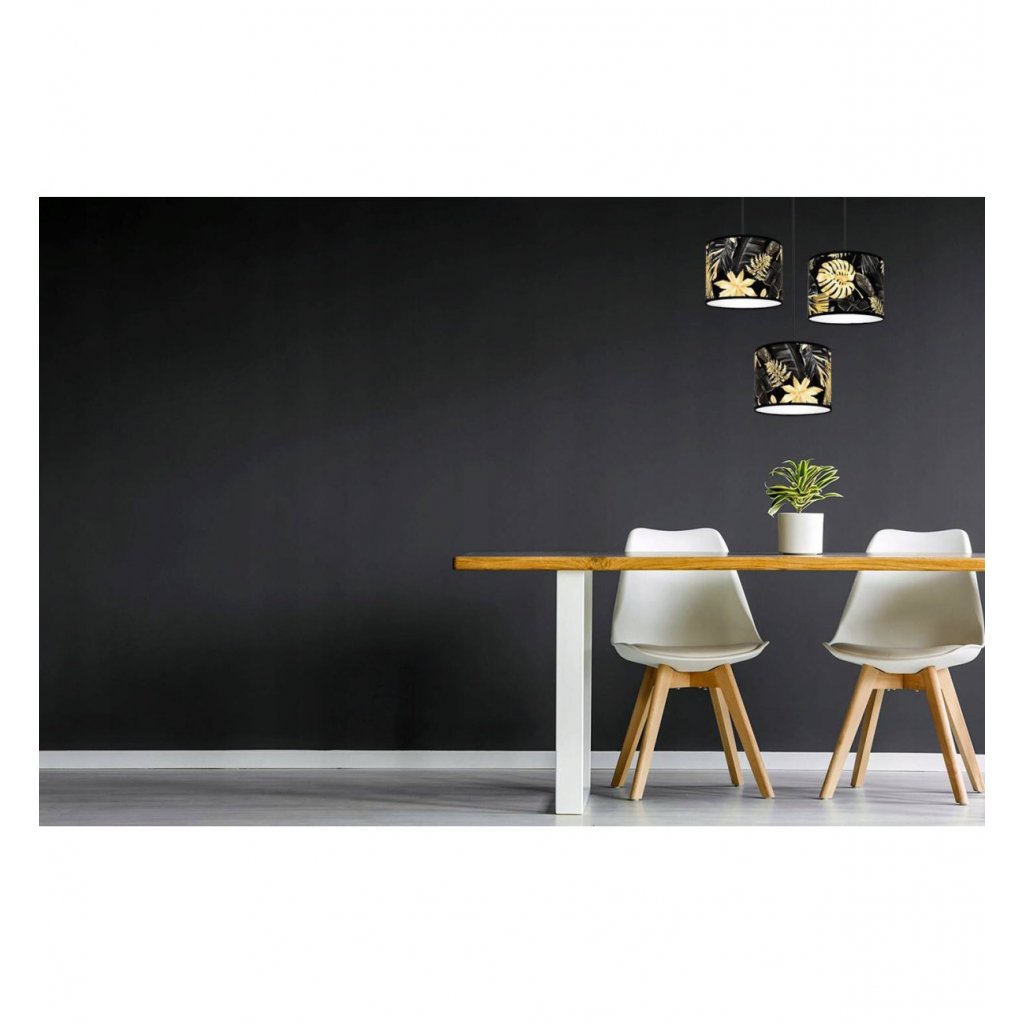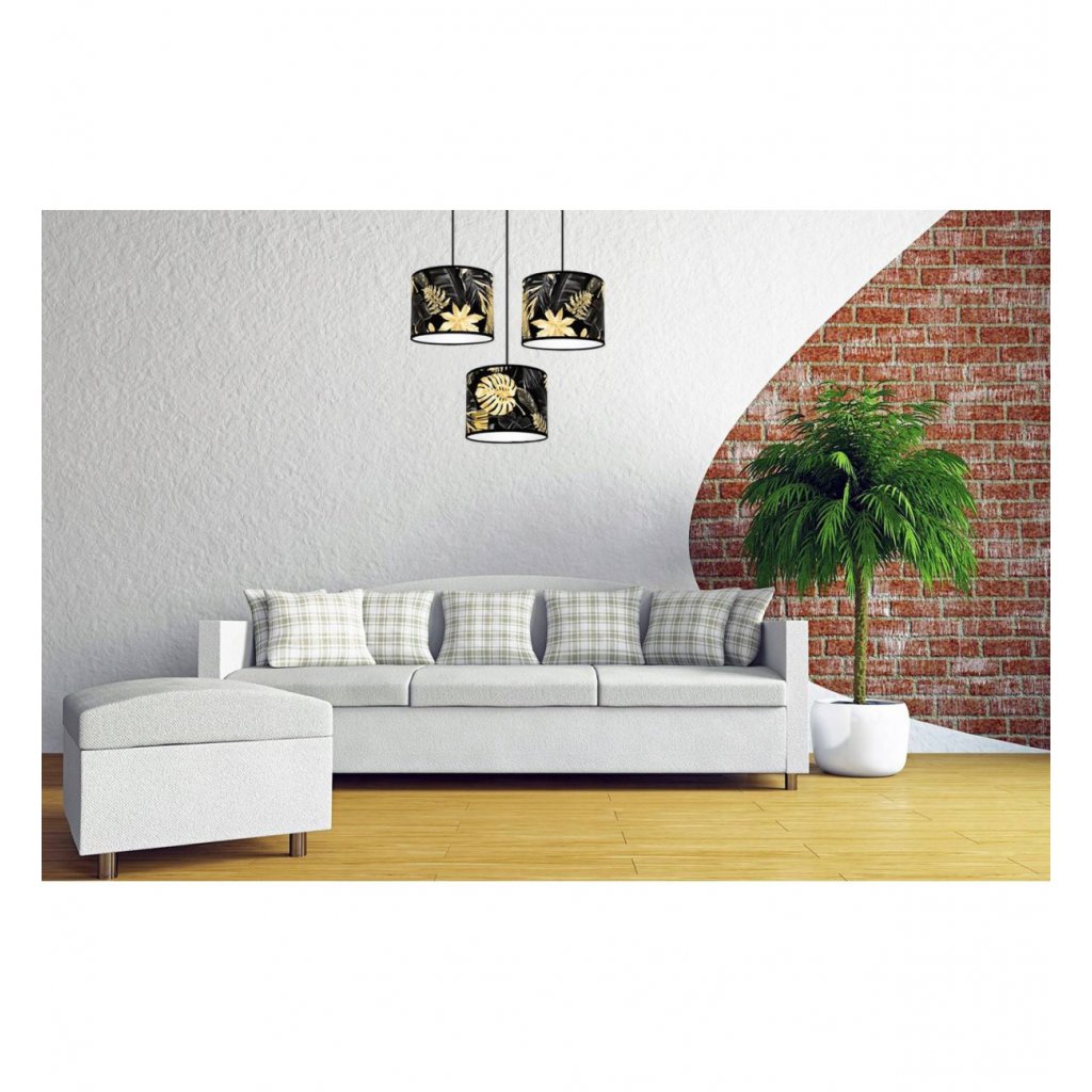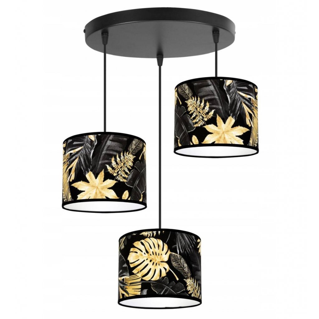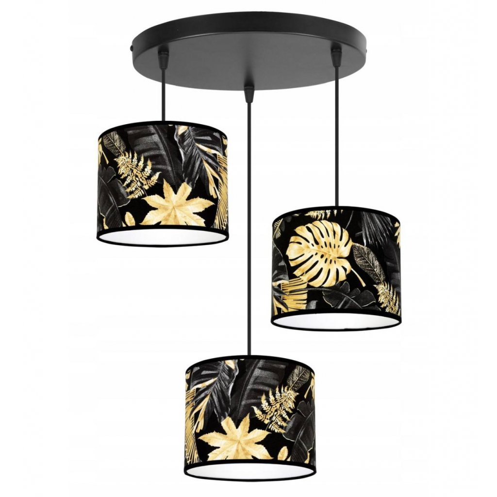 Závěsné svítidlo Gold Flowers, 3x černé textilní stínítko s květinovým vzorem,