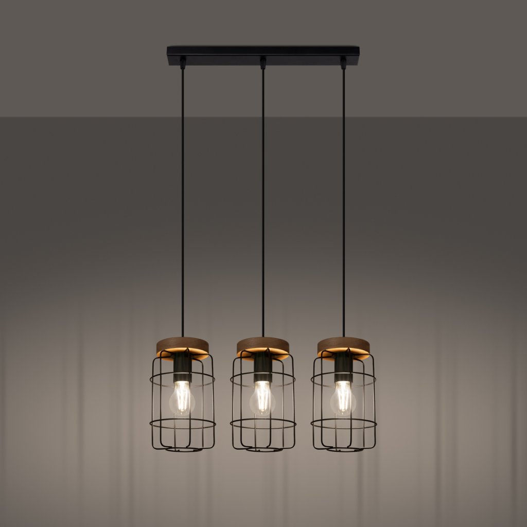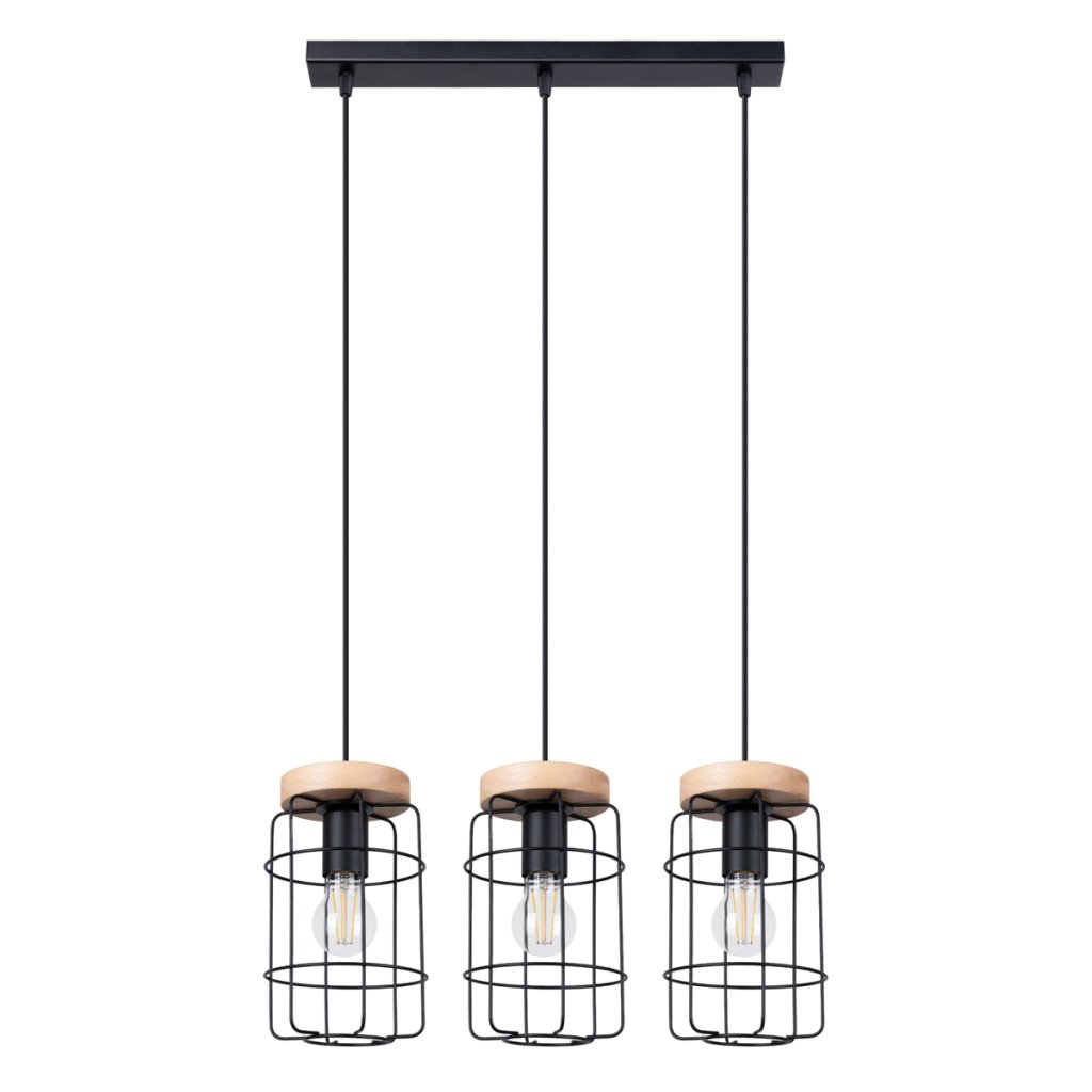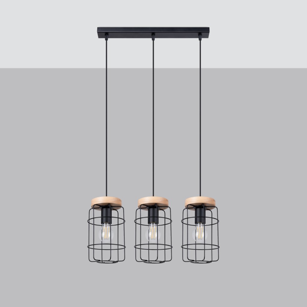 Závěsné svítidlo Gotto, 3x dřevěné/černé drátěné stínidlo