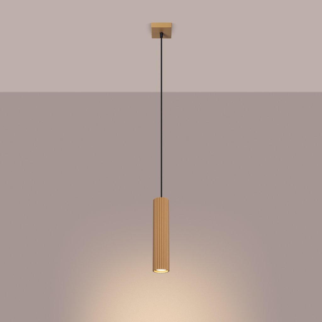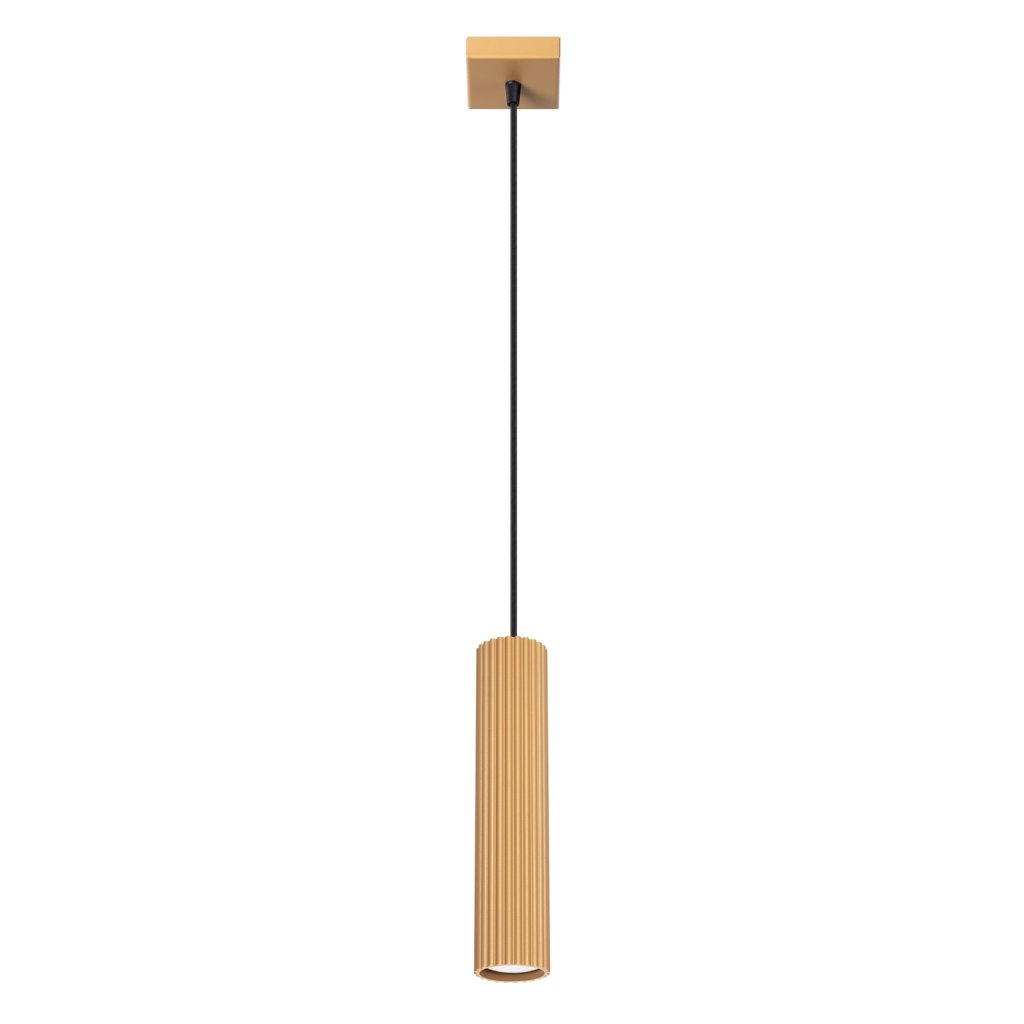Závěsná lampa KARBON s jedním zlatým kovovým stínidlem je elegantním doplňkem moderních interiérů. Minimalistický tvar a jemně žebrovaný povrch vytvářejí jedinečný design, který se skvěle hodí do kuchyně, jídelny nebo nad bar. Zlaté stínidlo lampy vnese do prostoru teplo, styl a nenápadný nádech luxusu.