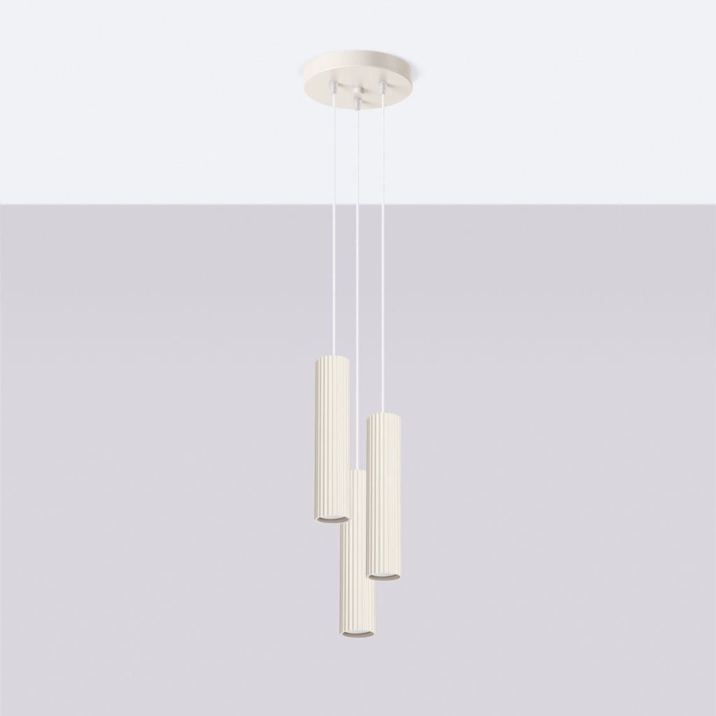 Závěsné svítidlo KARBON s třemi béžovými kovovými stínidly je dokonalou ukázkou spojení elegance, minimalismu a moderní estetiky. Jeho jemná žebrovaná struktura dodává interiéru sofistikovaný nádech a zároveň působí jako decentní designový akcent.