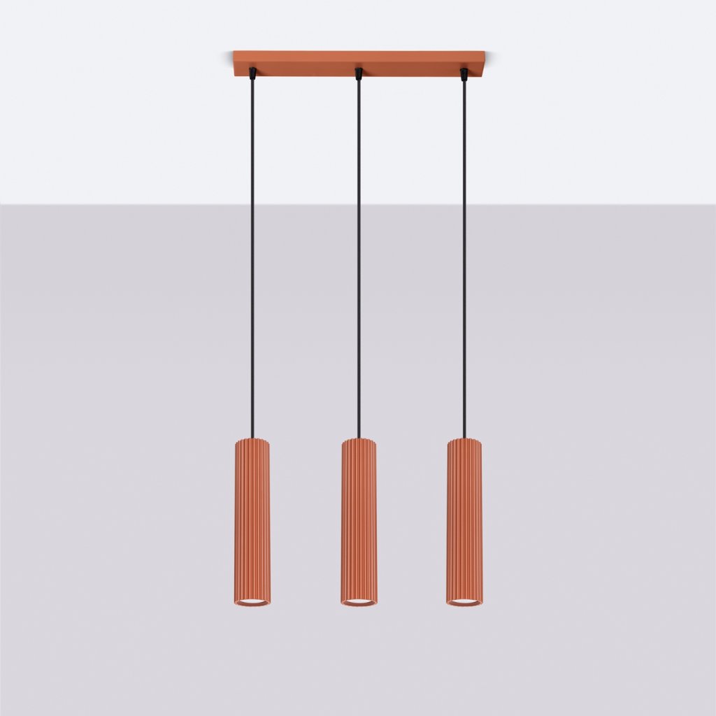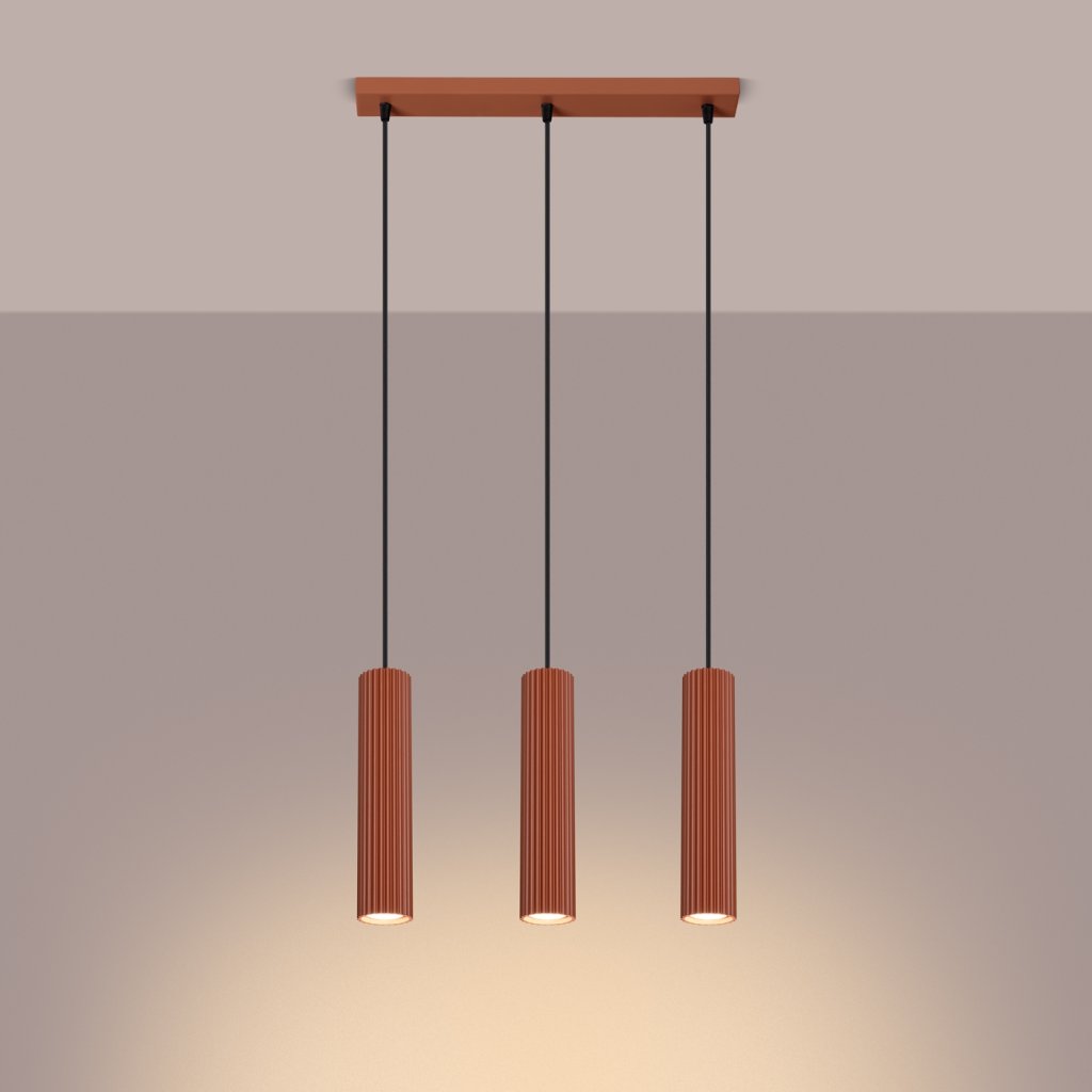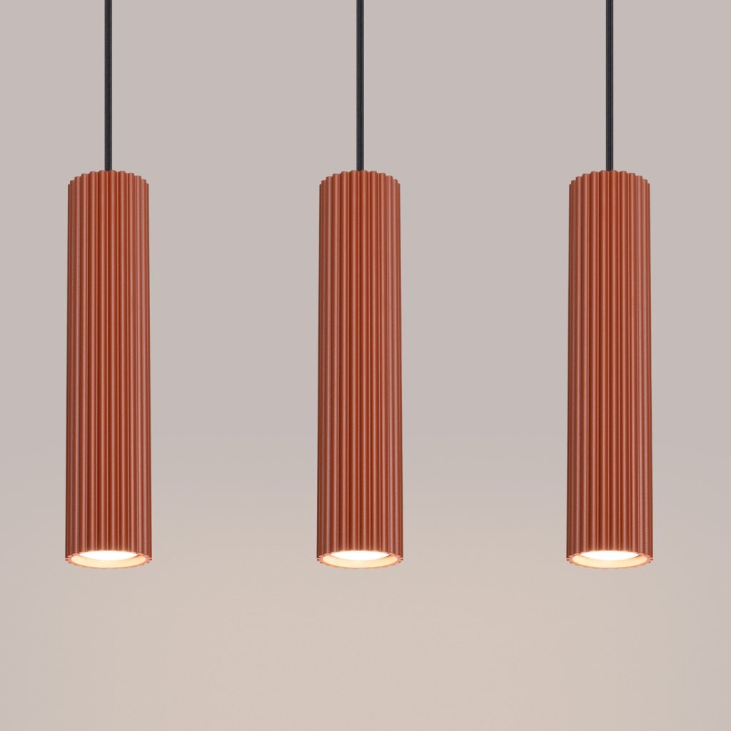Závěsné svítidlo KARBON s třemi okrově červenými kovovými stínidly přináší do interiéru hřejivý a zároveň moderní akcent. Jemně žebrovaný povrch stínidel působí elegantně a dodává svítidlu jedinečný charakter, který se skvěle hodí do moderních, minimalistických nebo industriálních prostor.
