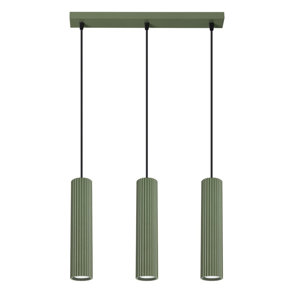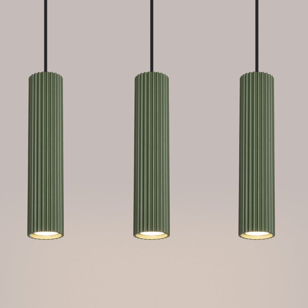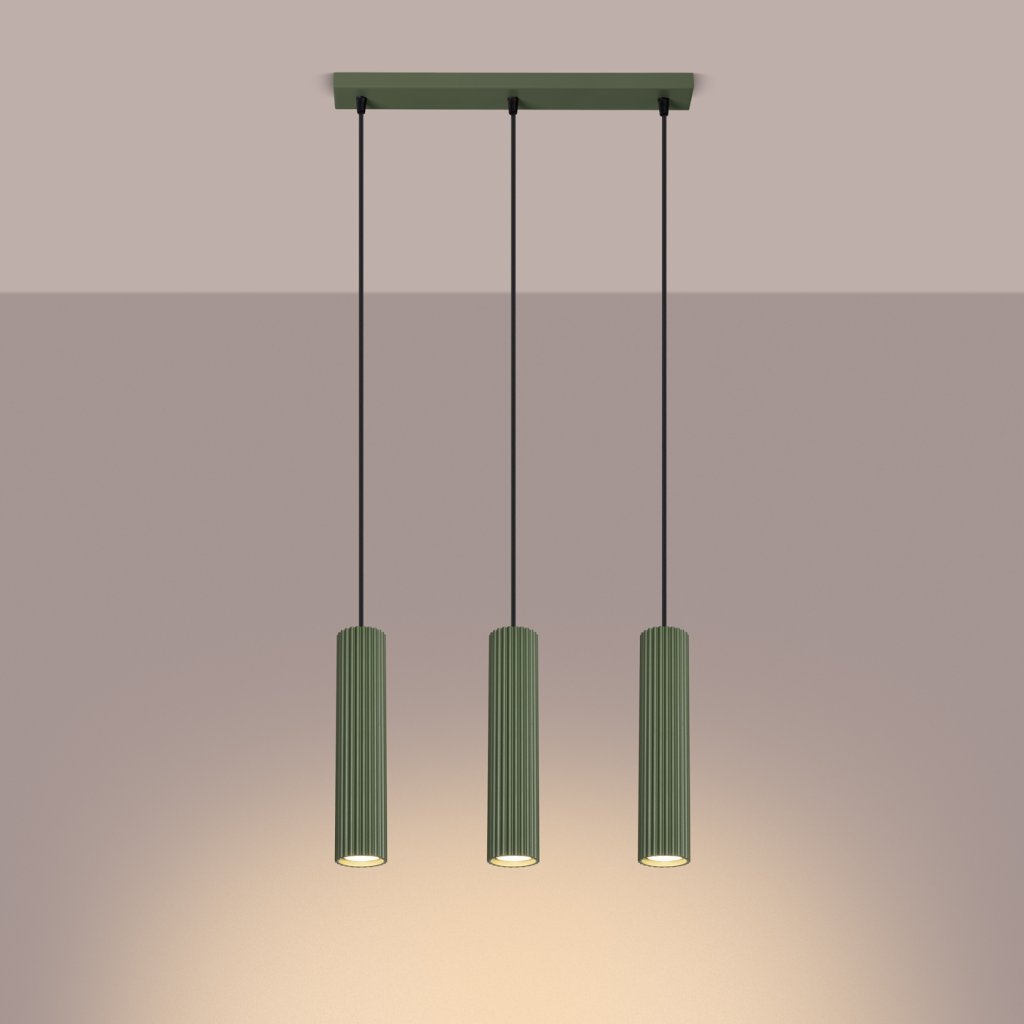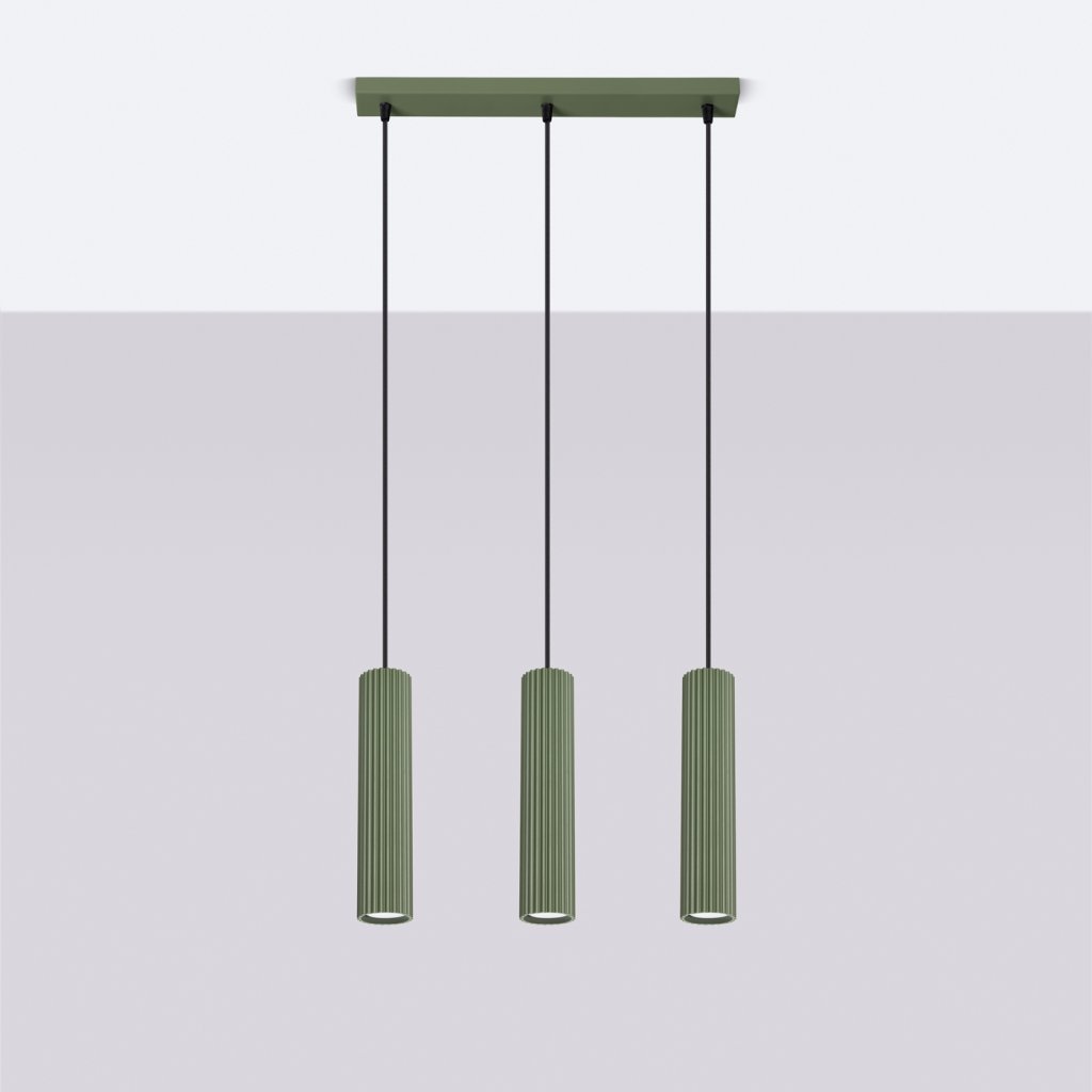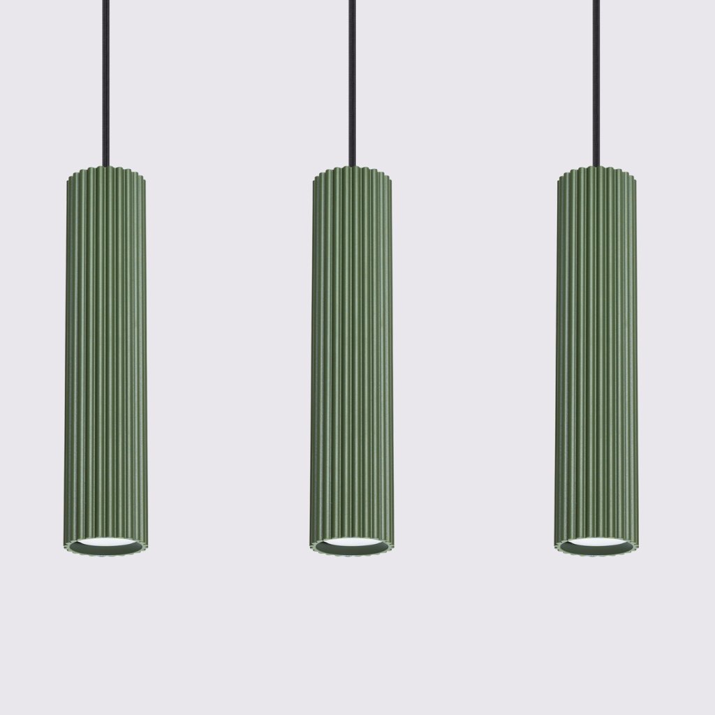 Závěsné svítidlo KARBON s třemi olivově zelenými kovovými stínidly je elegantním řešením pro moderní interiéry kombinující jednoduchost, funkčnost a estetiku. Jemně žebrovaný povrch stínidel dodává svítidlu osobitý charakter a vytváří příjemnou hru světla a stínu.