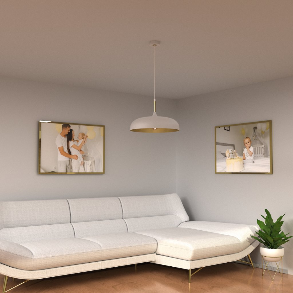 Minimalistické závěsné svítidlo s bílým kovovým stínítkem a zlatým vnitřním povrchem nabízí dokonalé spojení funkčnosti, čistého designu a jemné elegance . Díky své jednoduché formě bez dekorací vytváří v interiéru klidnou a vyváženou atmosféru .
