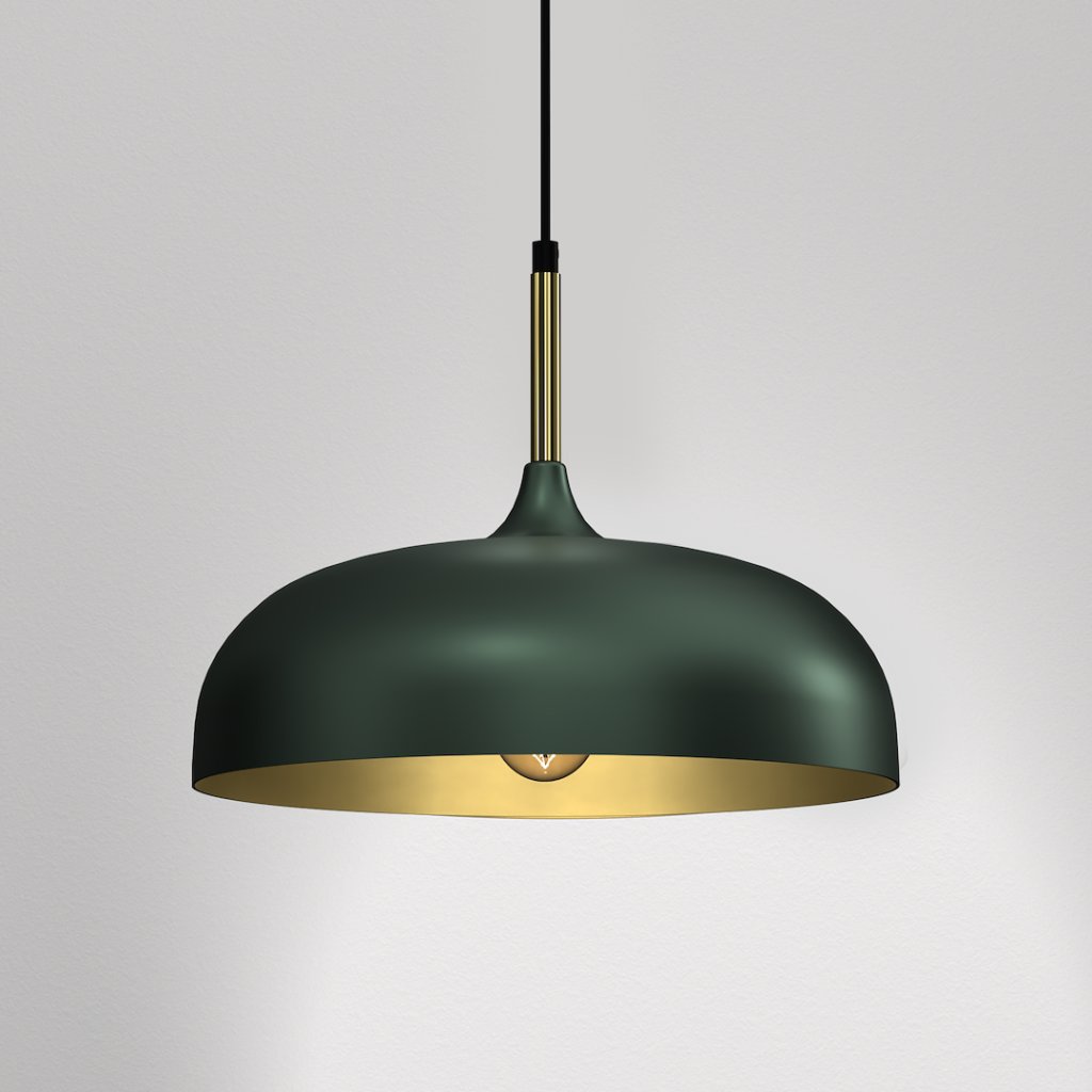 Minimalistické závěsné svítidlo s kovovým stínítkem v tmavě zelené barvě a zlatým vnitřním povrchem představuje ideální rovnováhu mezi funkčností a designovou jednoduchostí . Díky svému nadčasovému vzhledu vynikne zejména v minimalistických, klasických i moderních interiérech .