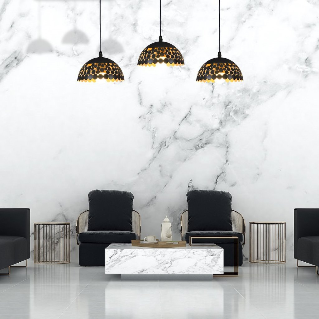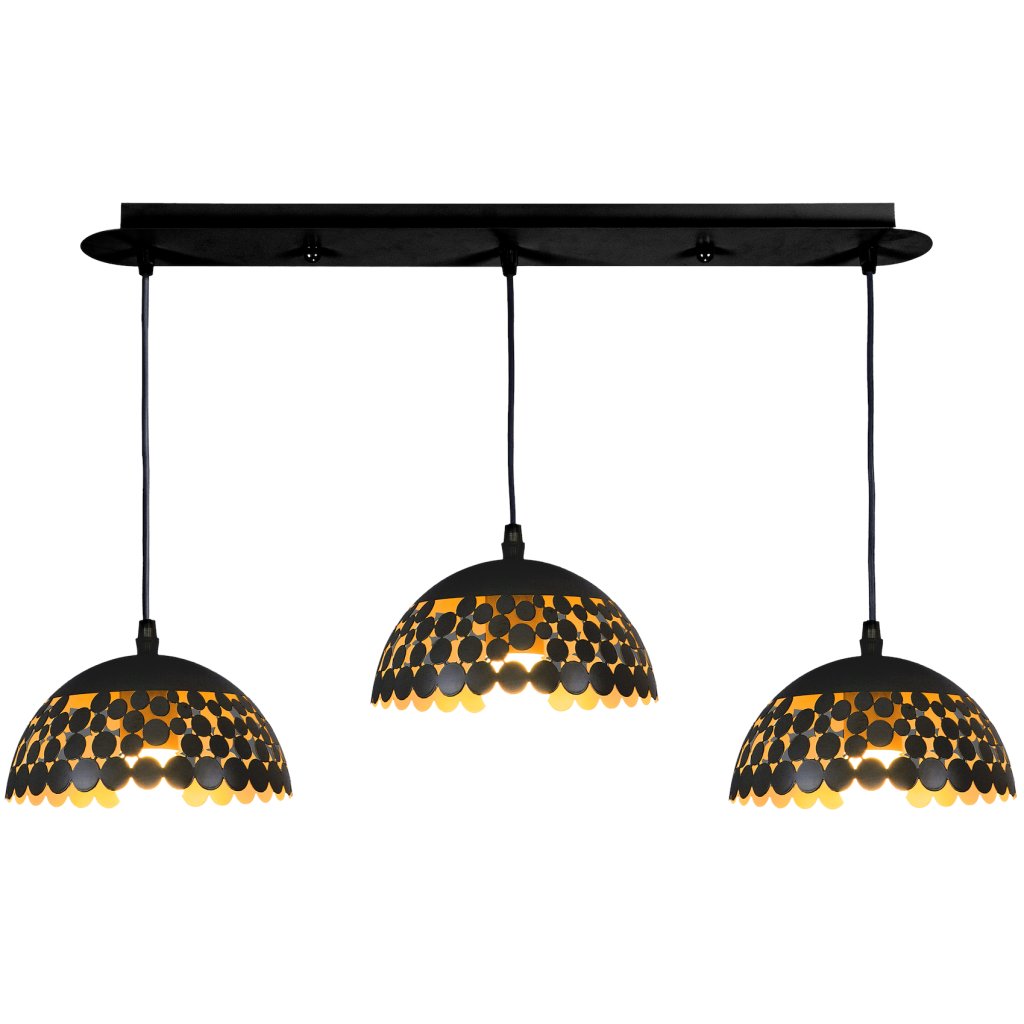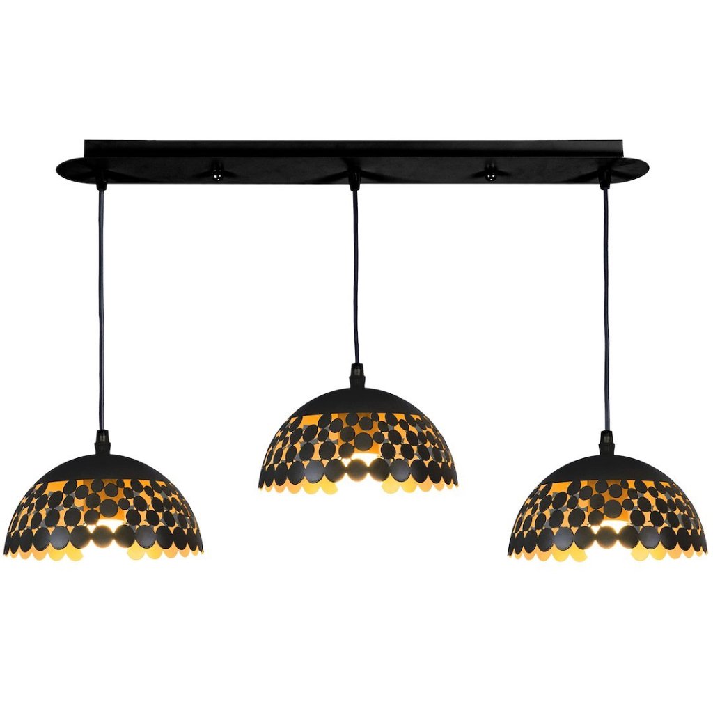 Závěsné svítidlo Lisa se 3 černými kovovými stínítky je součástí výjimečné kolekce, která spojuje elegantní design a dekorativní funkci. Svítilna je vyrobena z kvalitního kovu a zaujme dekorativními perforovanými stínítky s jemným zlatým vnitřkem , které vytvářejí ve večerních hodinách nádherné světelné efekty.