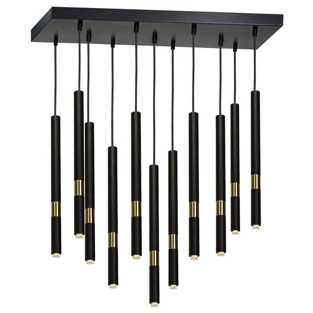 Závěsné svítidlo MONZA s 11 černo-zlatými kovovými stínítky ve tvaru štíhlých válců představuje efektní a vizuálně výrazné řešení osvětlení pro moderní interiéry. Elegantní kompozice zavěšená na okrouhlé rozetě přináší do prostoru dokonalou souhru funkčnosti a estetické hodnoty.