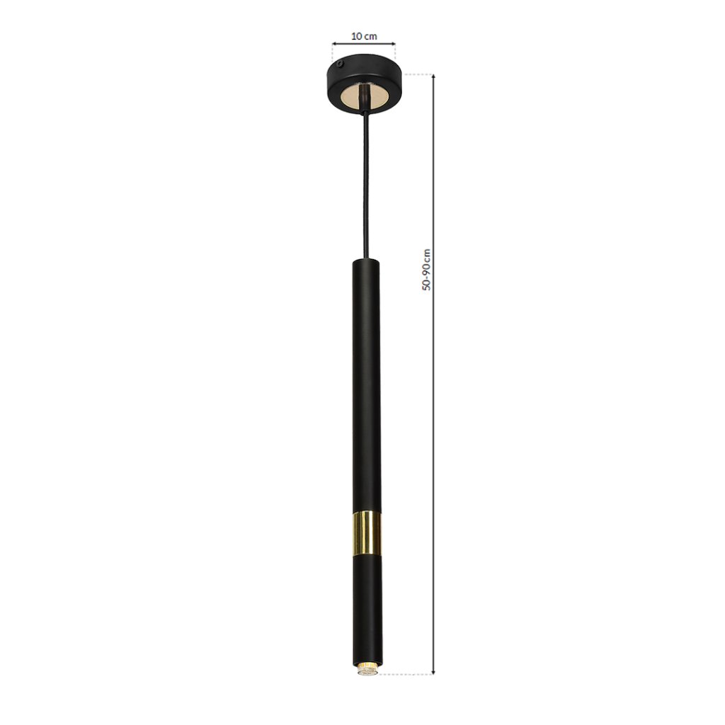 Jednoplamenné závěsné svítidlo MONZA s černým kovovým stínítkem ve tvaru štíhlého válce je stylovým řešením osvětlení pro moderní i klasické interiéry. Minimalistický design s precizním zpracováním a jemným zlatým detailem uvnitř stínítka dodává prostoru eleganci a útulnou atmosféru.