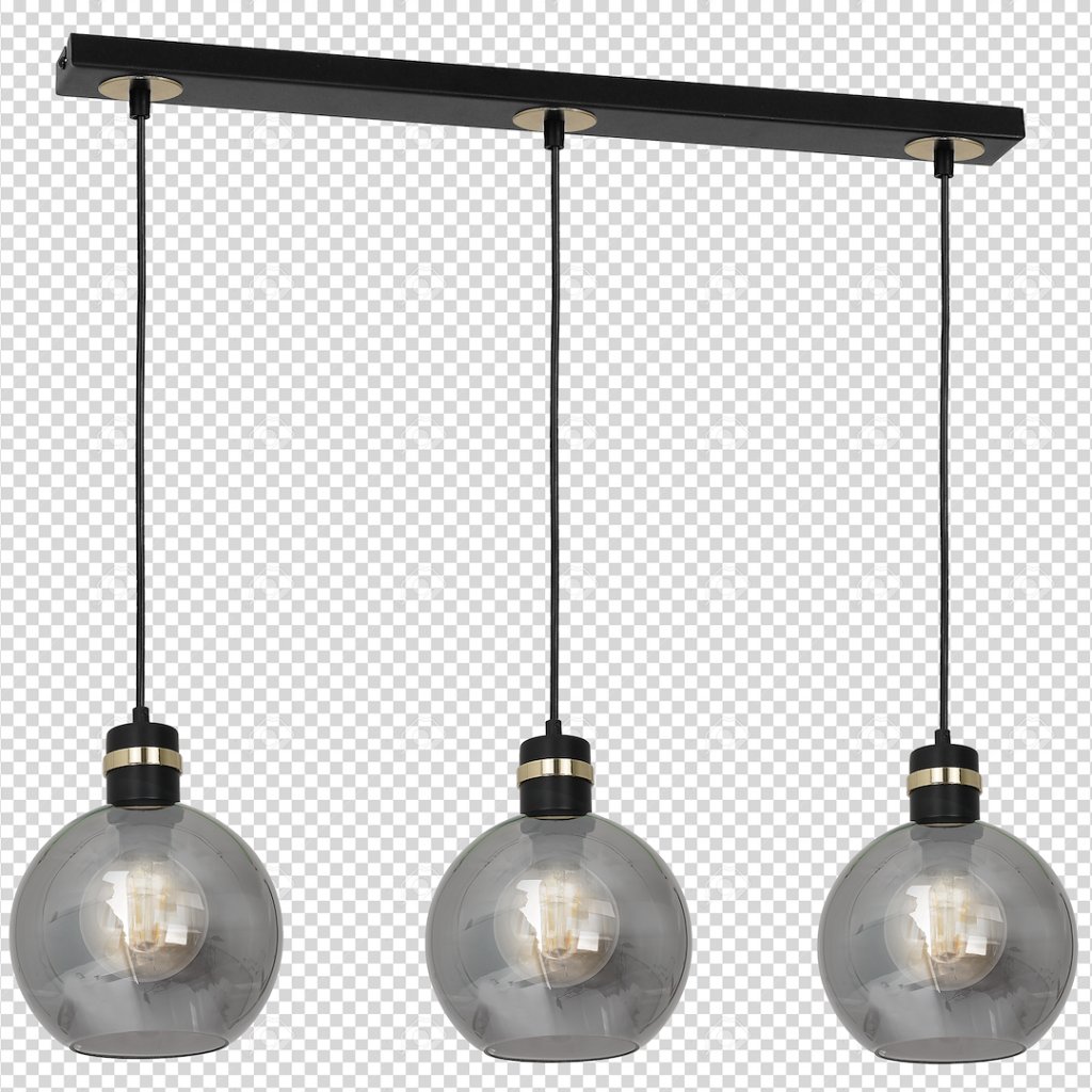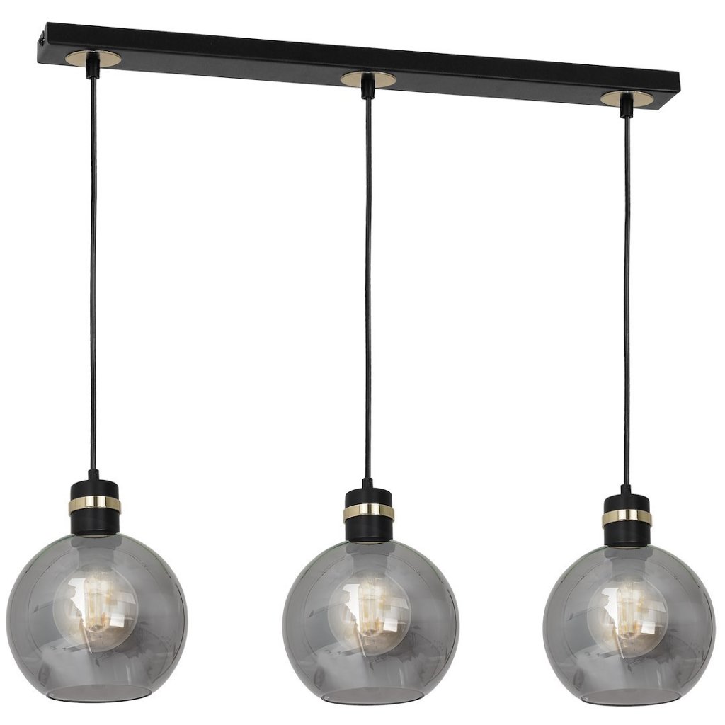 Závěsné svítidlo OMEGA se třemi grafitovými skleněnými stínítky a jemnými zlatými prvky představuje harmonické spojení moderního designu a nadčasové elegance. Stínítka ve tvaru koule jsou vyrobena z kouřového skla, které vytváří příjemné a tlumené osvětlení.
