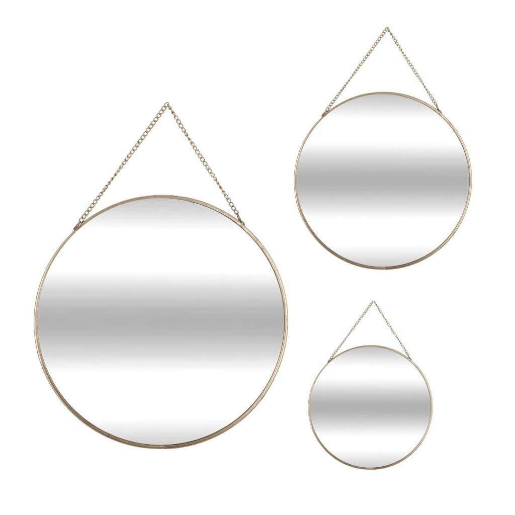 Zrcadlo je univerzálním doplňkem, který kromě praktické hodnoty bude také atraktivní dekorací na zeď. Výběrem této sady zrcadel můžeme libovolně upravovat jejich vzájemnou polohu a vytvářet tak neobvyklé kompozice. Kulatá zrcadla jsou zasazena do zlatých kovových rámů, což umocňuje vizuální efekt.Rozměry jednotlivých zrcadel: