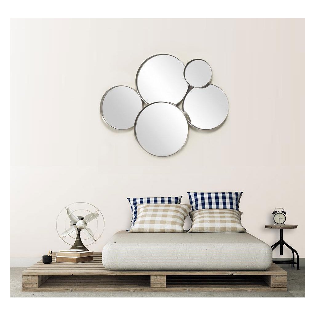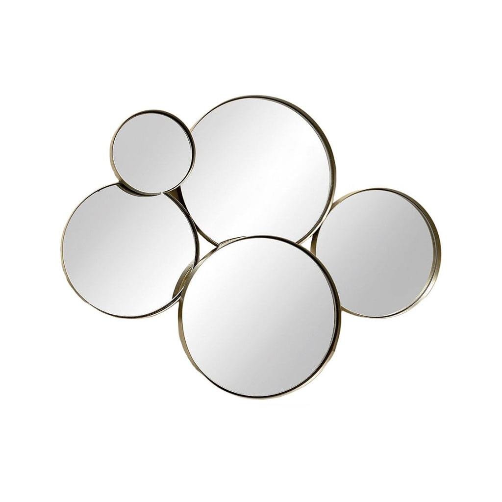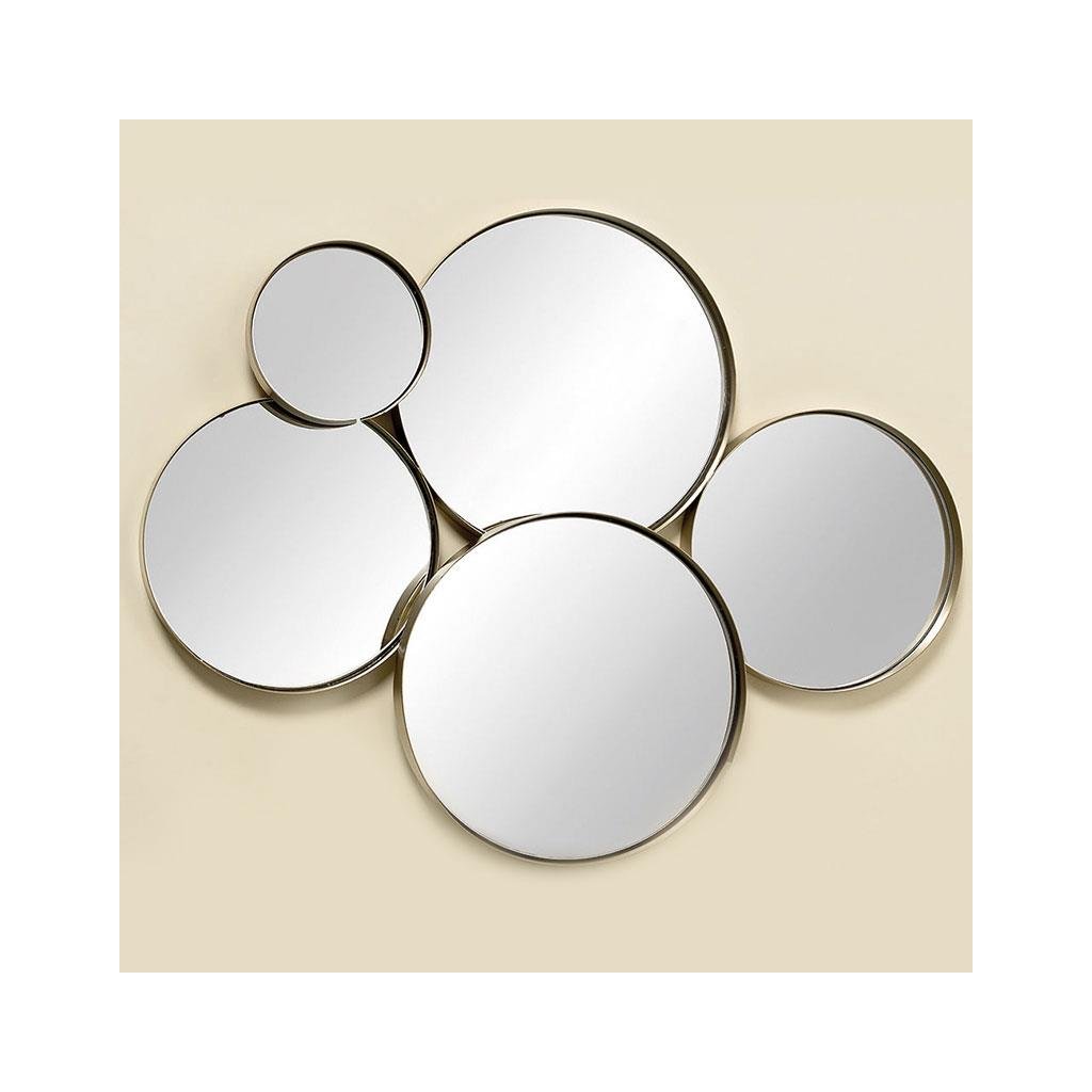 Sada 5 ks navzájem spojených kulatých zrcadel, ve zlatých kovových rámech, je praktickým dokončovacím prvkem do vašeho bytu. Skvěle se hodí do klasických i moderních interiérů. Umožňuje vám rychle a snadno osvěžit a zcela změnit váš interiér.Průměry jednotlivých zrcadel: