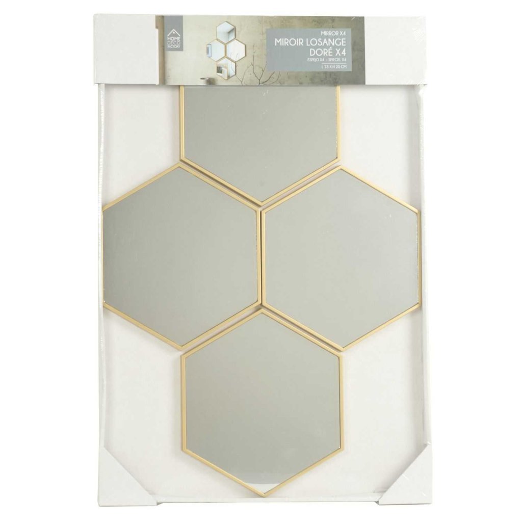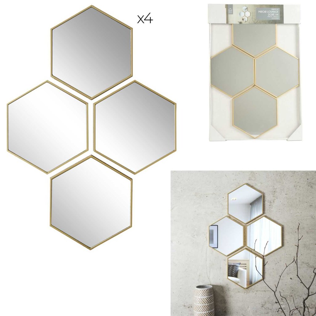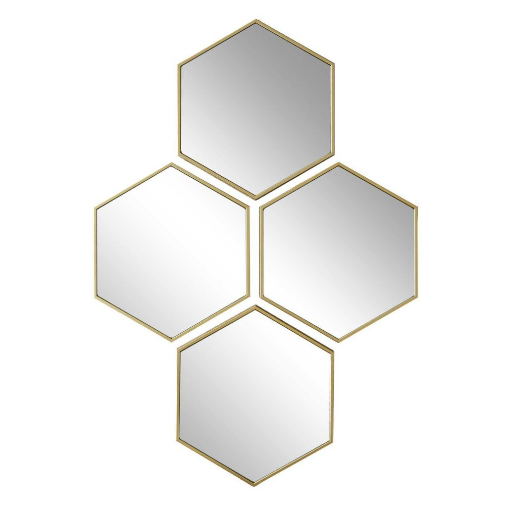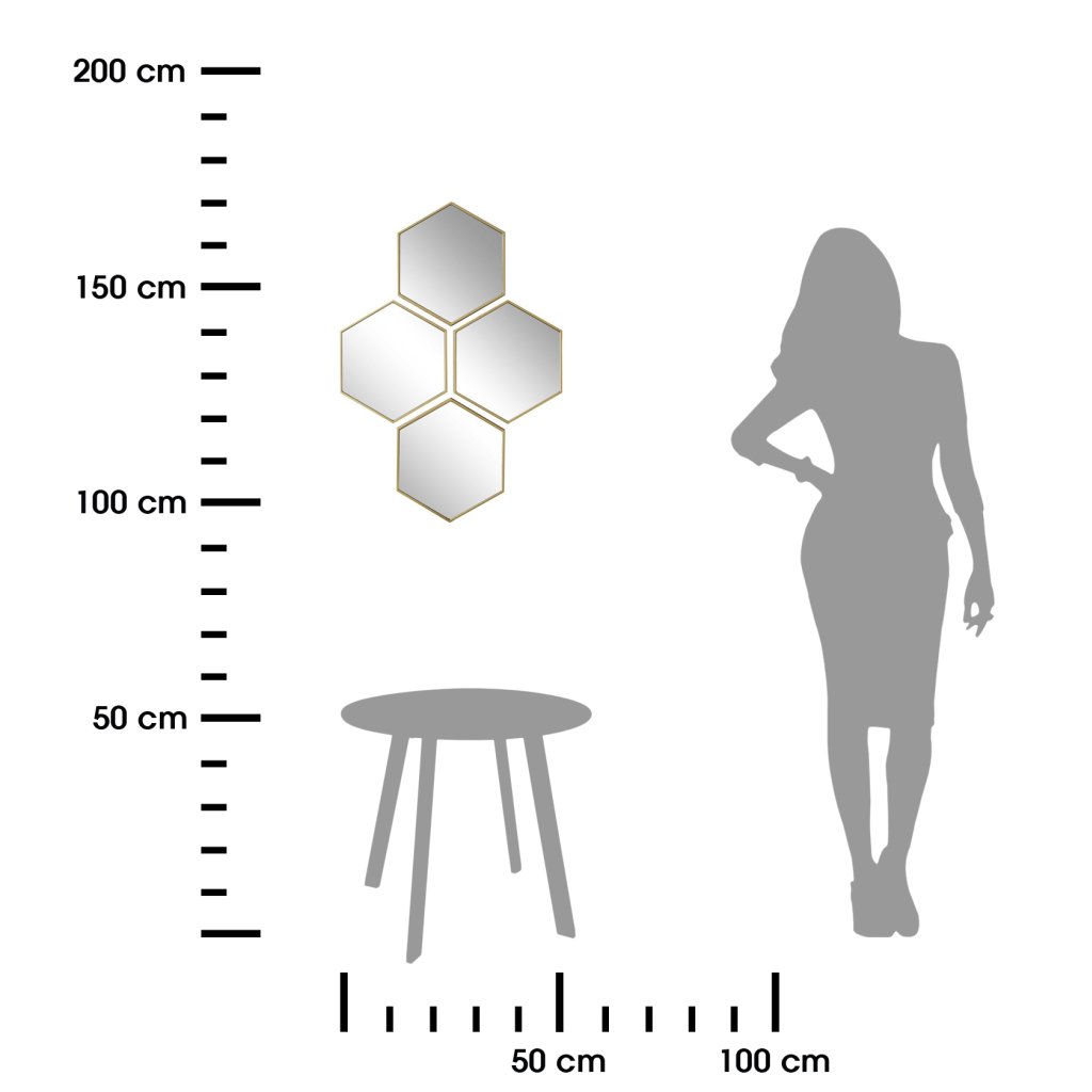 Sada čtyř nástěnných zrcadel Hexi ve tvaru šestiúhelníků zaujme svou geometrickou formou a zlatým rámem , který vnese do interiéru jemný lesk a eleganci. Díky modernímu designu jsou zrcadla vhodná do různých prostor – od obývacího pokoje a předsíně až po ložnici či koupelnu .