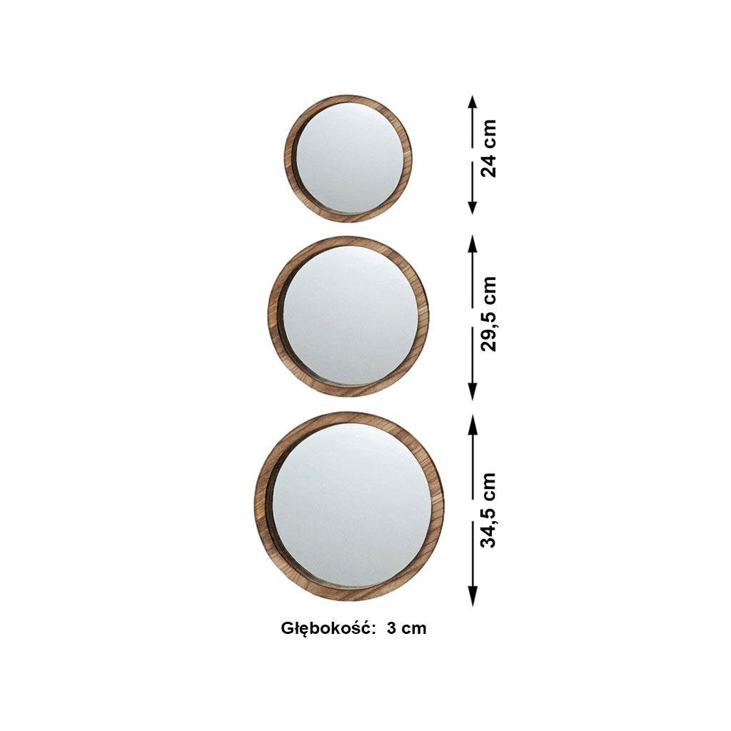 Zrcadla mají tyto rozměry: malá – průměr 24 cm , střední – průměr 29,5 cm , velká – průměr 34,5 cm . Všechny s hloubkou 3 cm. Díky kombinaci praktické funkce a dekorativního vzhledu představuje tato sada ideální řešení pro oživení holých stěn i optické zvětšení prostoru.
