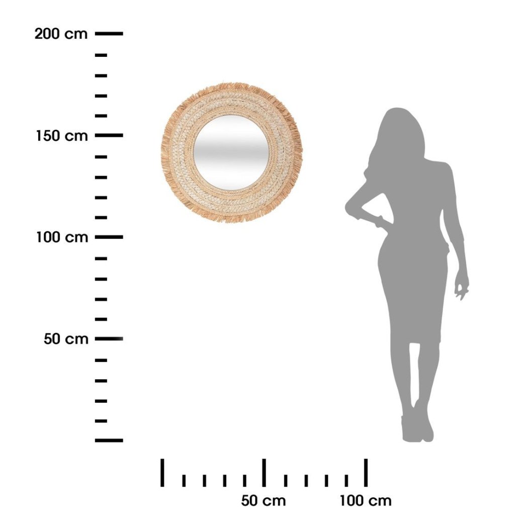 Kulaté nástěnné zrcadlo v tkaném rámu z kukuřičného vlákna a rafie v přírodní barvě. Moderní zrcadla v originálních rámech jsou nejen mimořádné módní doplňky, ale také samostatná dekorace. Skvěle se hodí jako nástěnná dekorace a doplněk k aranžmá v přírodním, boho nebo skandinávském stylu. Díky svému univerzálnímu designu zrcadlo zapadne do klasických i modernějších kompozicí, obohatí interiér a dodá mu originalitu.Průměr: 68 cm